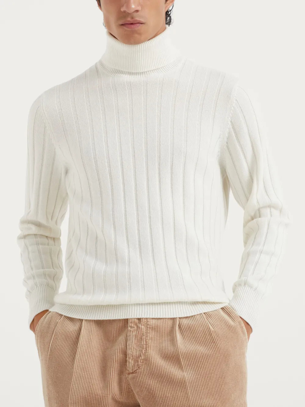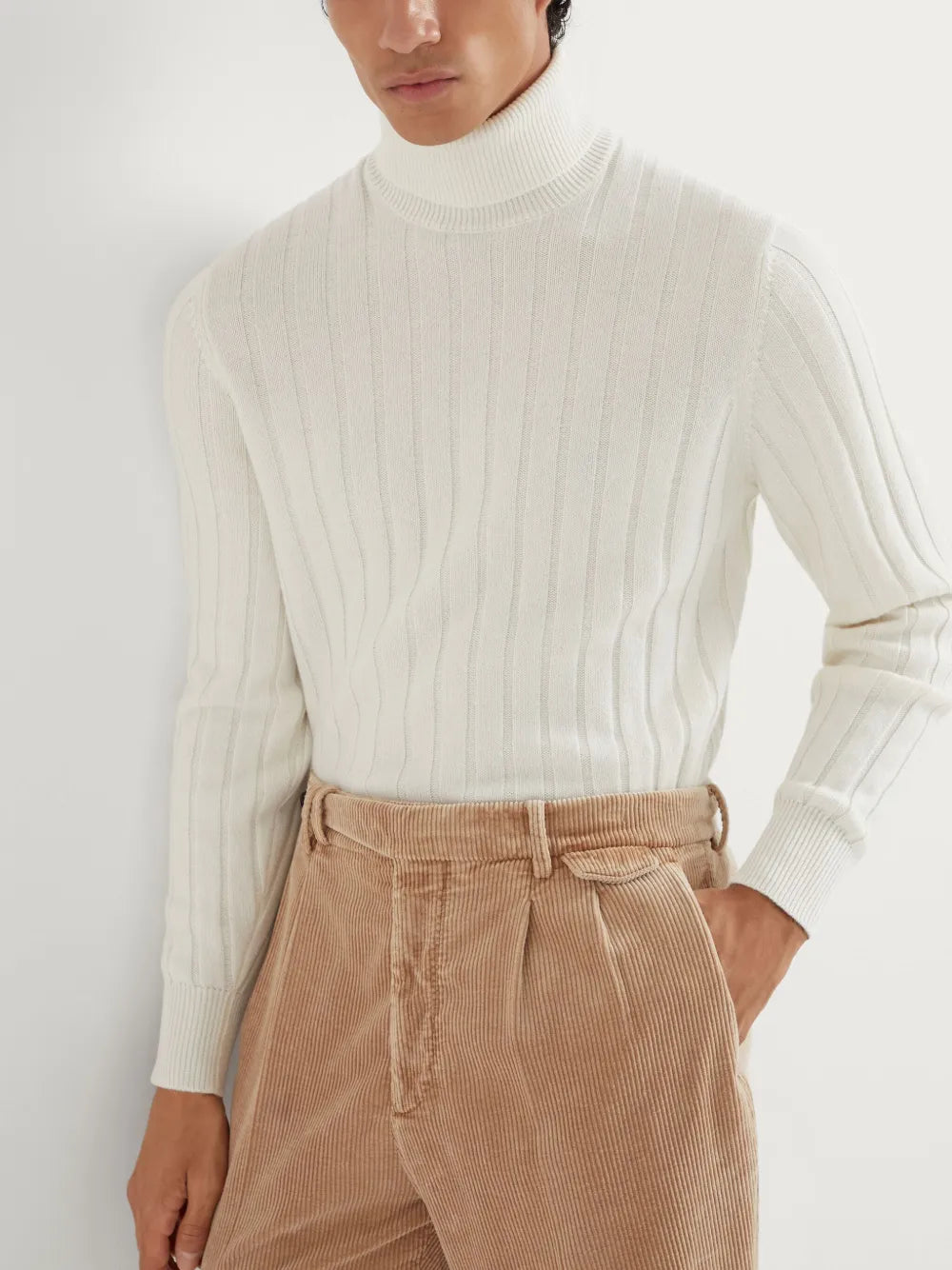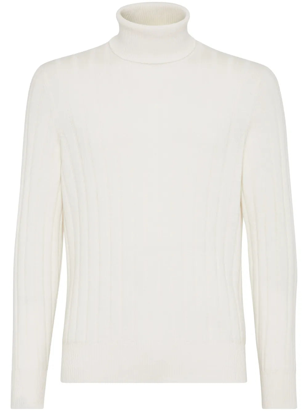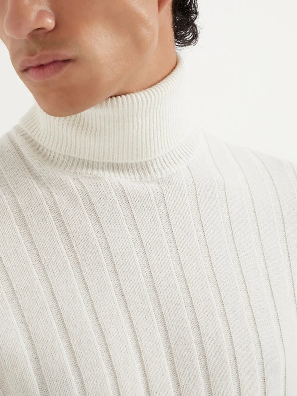 Expertly crafted from soft, luxurious cashmere, this white ribbed knit jumper boasts a timeless roll neck design and long sleeves. The straight hemline adds a classic touch, making it a versatile and elegant wardrobe staple. Stay warm and stylish in this must-have piece.