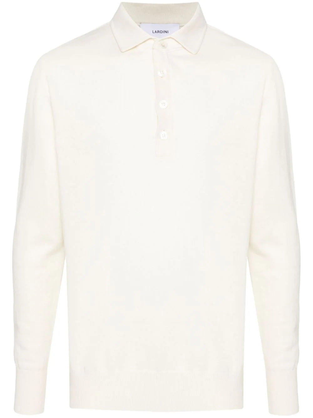 white cashmere fine knit front button placket polo collar long sleeves ribbed cuffs straight hem