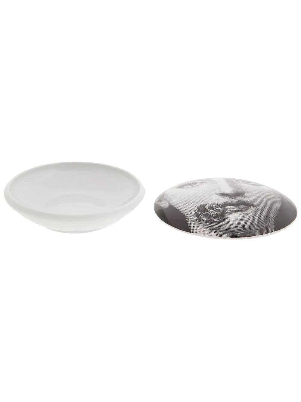 White ceramic box from Fornasetti featuring a matching lid with a print of a woman's face with a flower at the mouth.