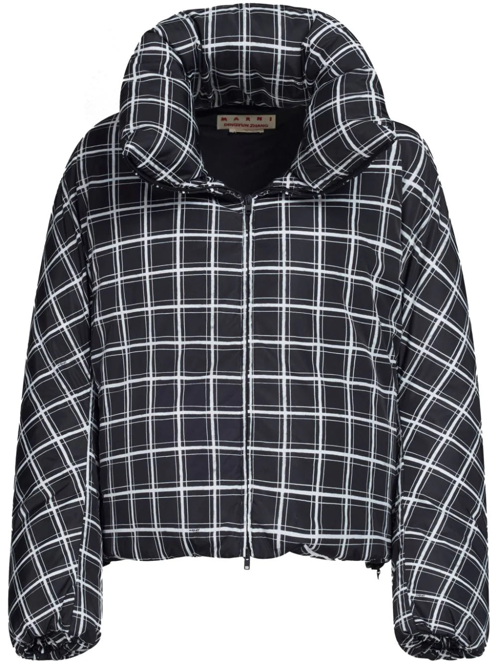 check-print padded jacket from MARNI featuring black/white, padded design, check print, front two-way zip fastening, stand-up collar, long sleeves and straight hem.