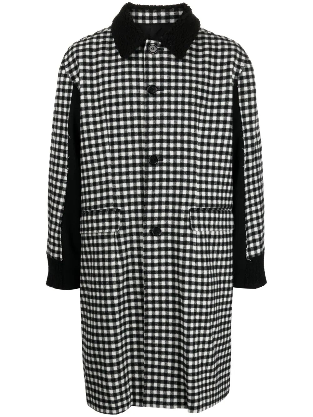black/white check print contrasting collar front button fastening drop shoulder long sleeves ribbed cuffs two front flap pockets straight hem mid-length