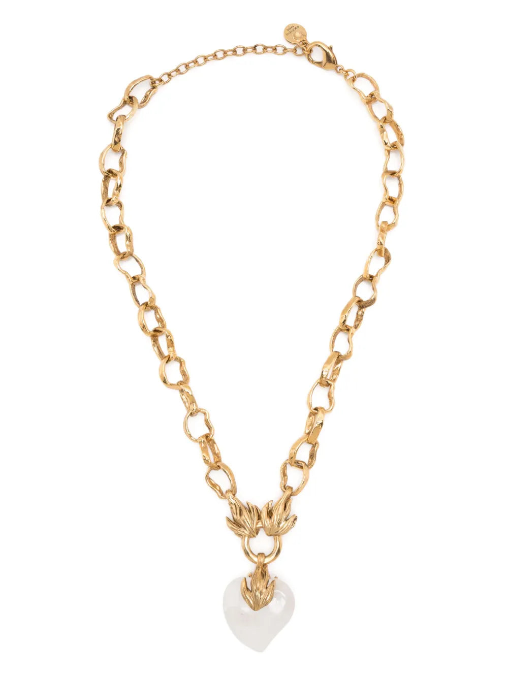 The Coeur Précieux Necklace features a gold-tone heart pendant adorned with a natural rock crystal, subtly enhanced by an engraved logo. Secured with a lobster claw fastening, this elegant piece combines refined craftsmanship with reliable wearability.