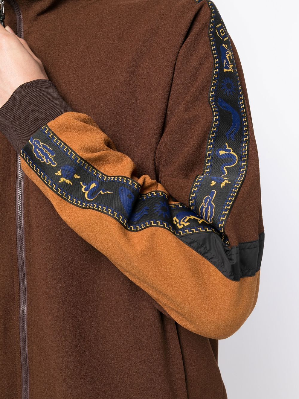 colour-block zipped sweater from TOGA VIRILIS featuring colour-block panelled design, side stripe detailing, front zip fastening, high neck, long sleeves, elasticated cuffs, elasticated hem and brown.