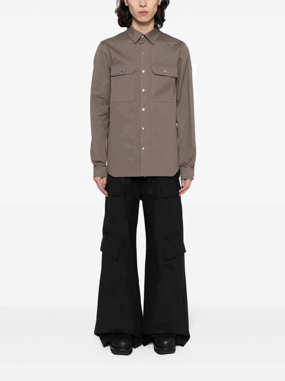 taupe brown stretch-cotton classic collar front press-stud fastening long sleeves two chest flap pockets curved hem