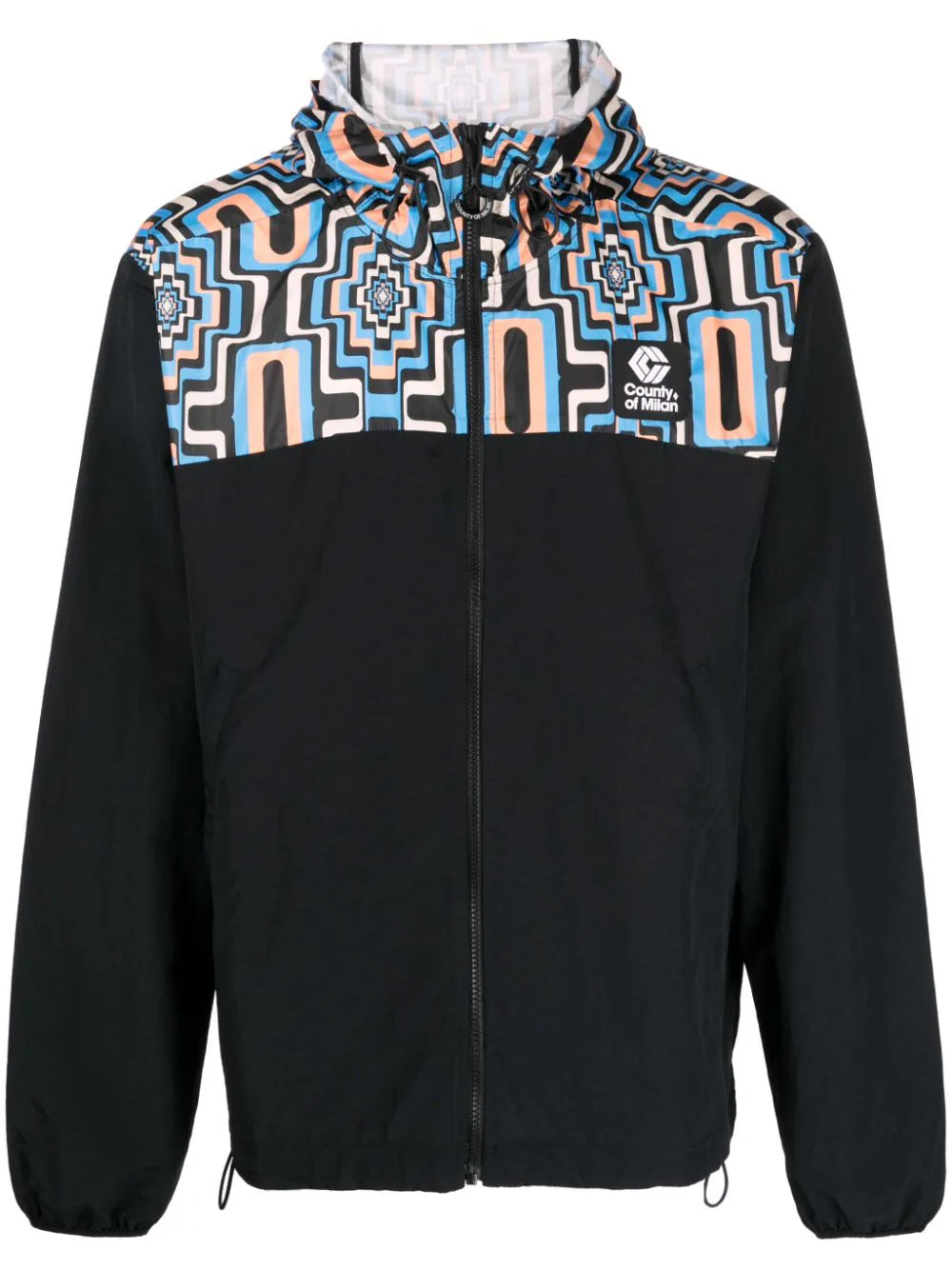 Cross-print panelled hooded windbreaker from Marcelo Burlon County of Milan featuring multicolour, signature Cross motif, contrasting panel detail, logo patch at the chest, drawstring hood, high neck, front zip fastening, long sleeves and drawstring hem.