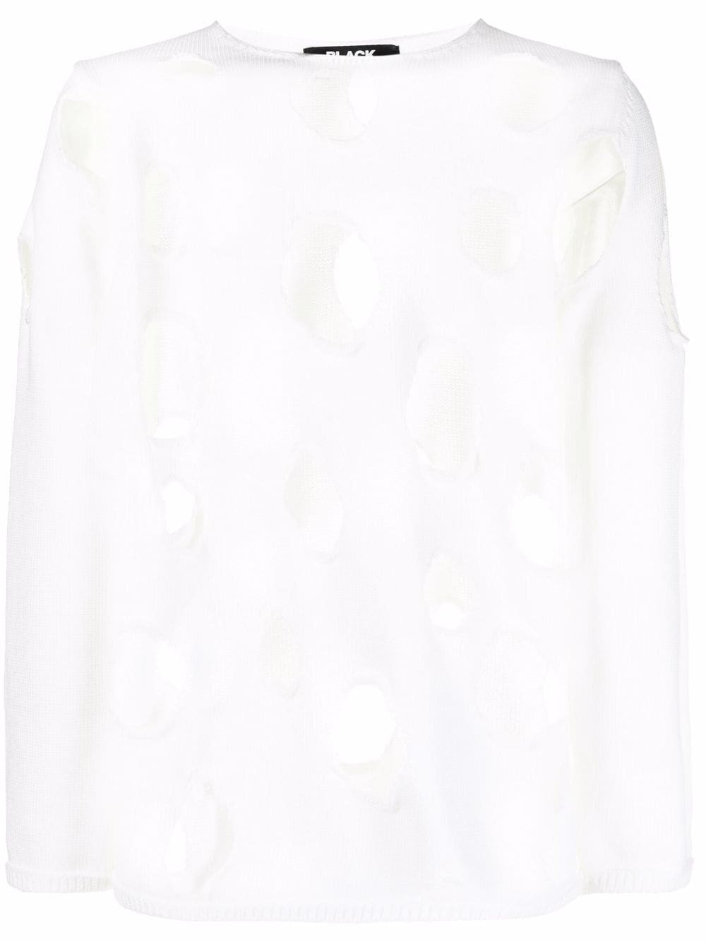 White cut-out hole jumper from BLACK COMME DES GARÇONS featuring knitted construction, ribbed detailing, cut-out detailing, round neck, long sleeves and raw edge.