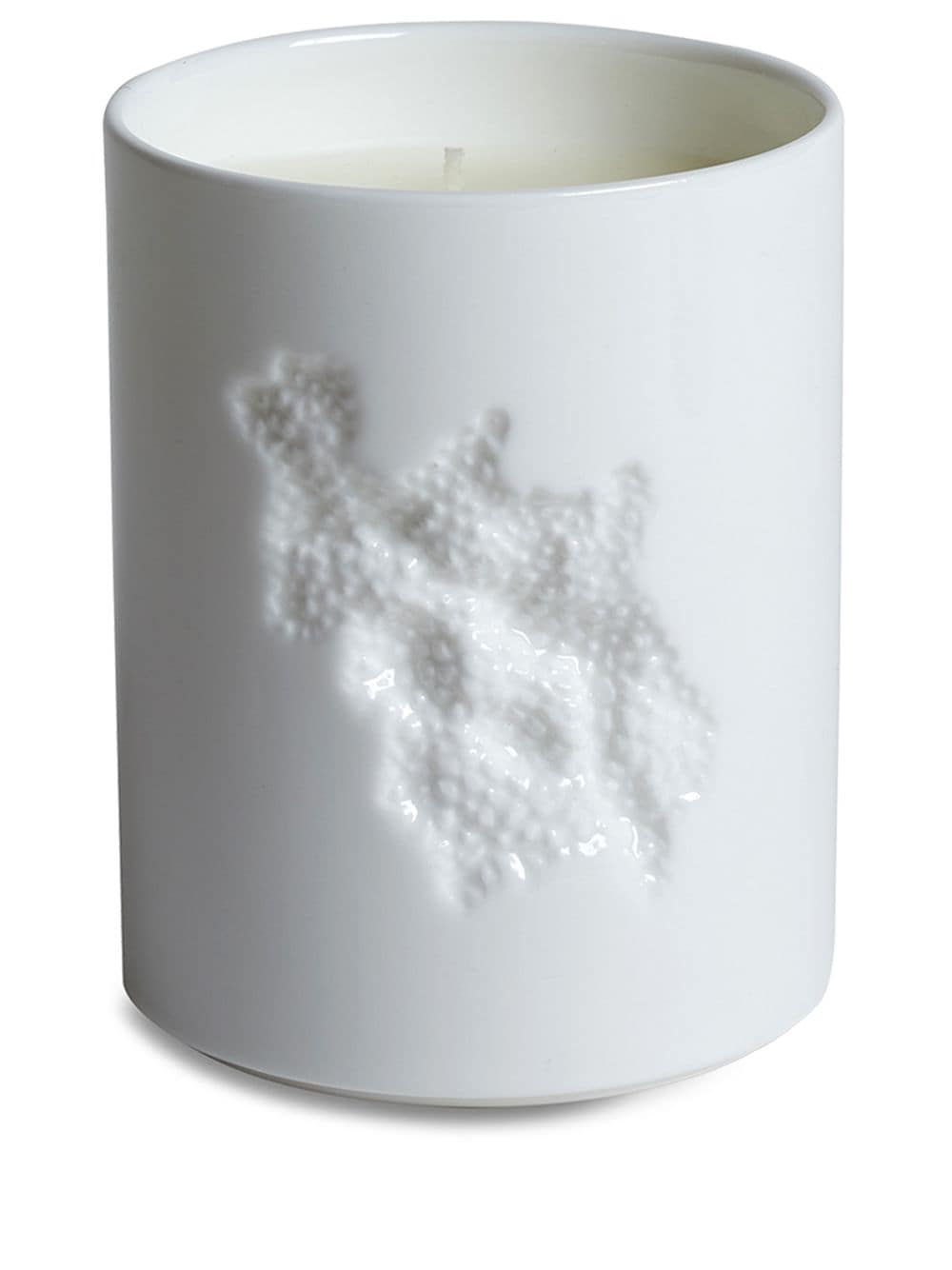 White wax/bone china Dissolve embossed candle from 1882 Ltd featuring embossed detail.