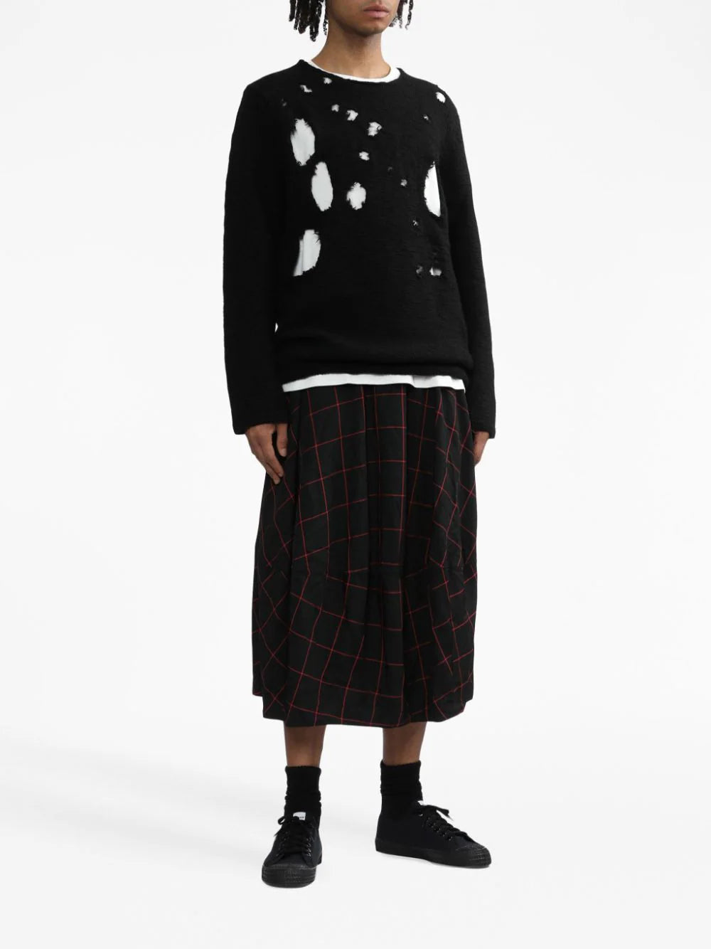 distressed-effect wool jumper from BLACK COMME DES GARÇONS featuring black, wool, distressed effect, ribbed trim, crew neck, long sleeves and straight hem.