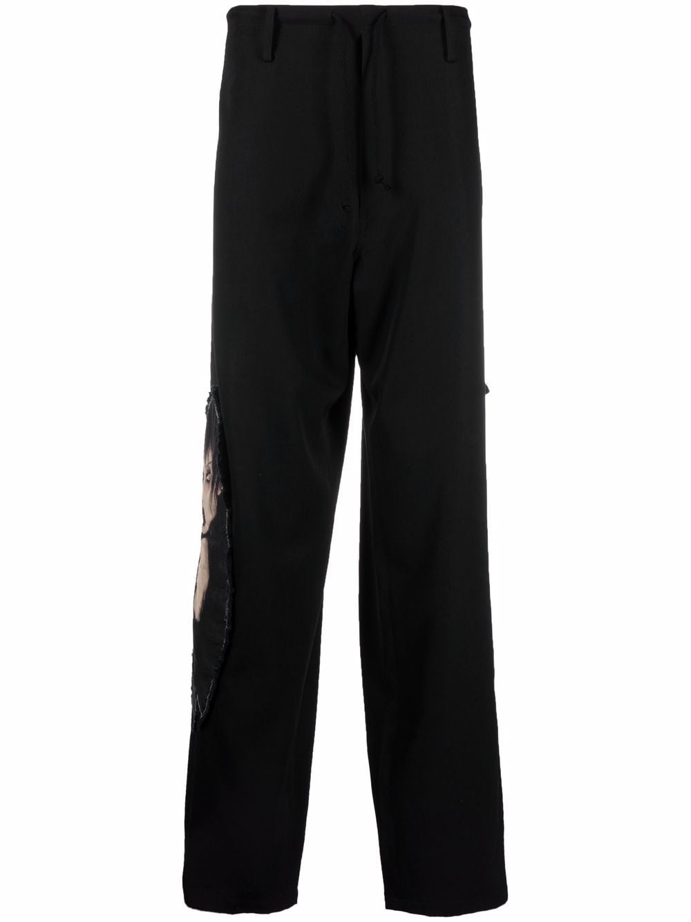 Black silk/cotton drawstring straight-leg trousers from YOHJI YAMAMOTO featuring graphic print to the front, straight leg, drawstring fastening, belt loops and two rear welt pockets.