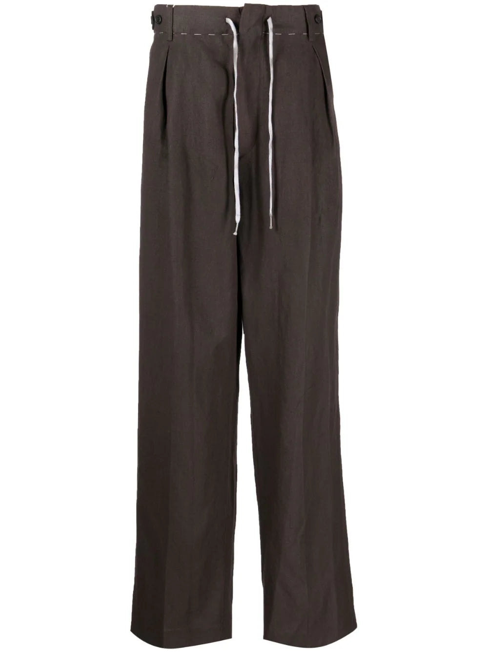drawstring straight-leg trousers from Maison Margiela featuring chocolate brown, linen/flax, wool blend, drawstring fastening waist, straight leg, two side slit pockets and two rear welt pockets.