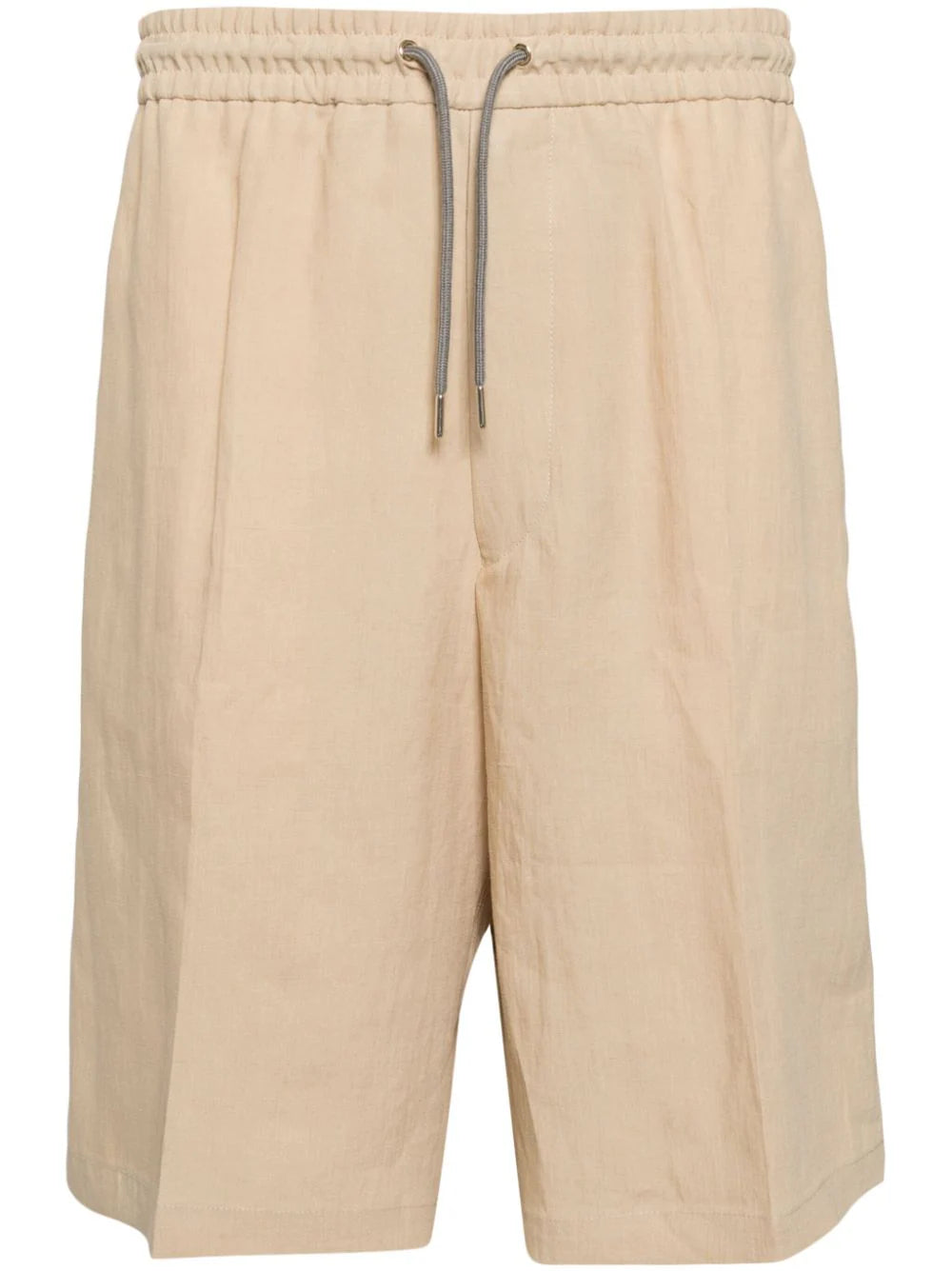 sand beige linen/flax pleat detailing mid-rise elasticated drawstring waistband straight leg two side slit pockets rear jetted pocket knee-length