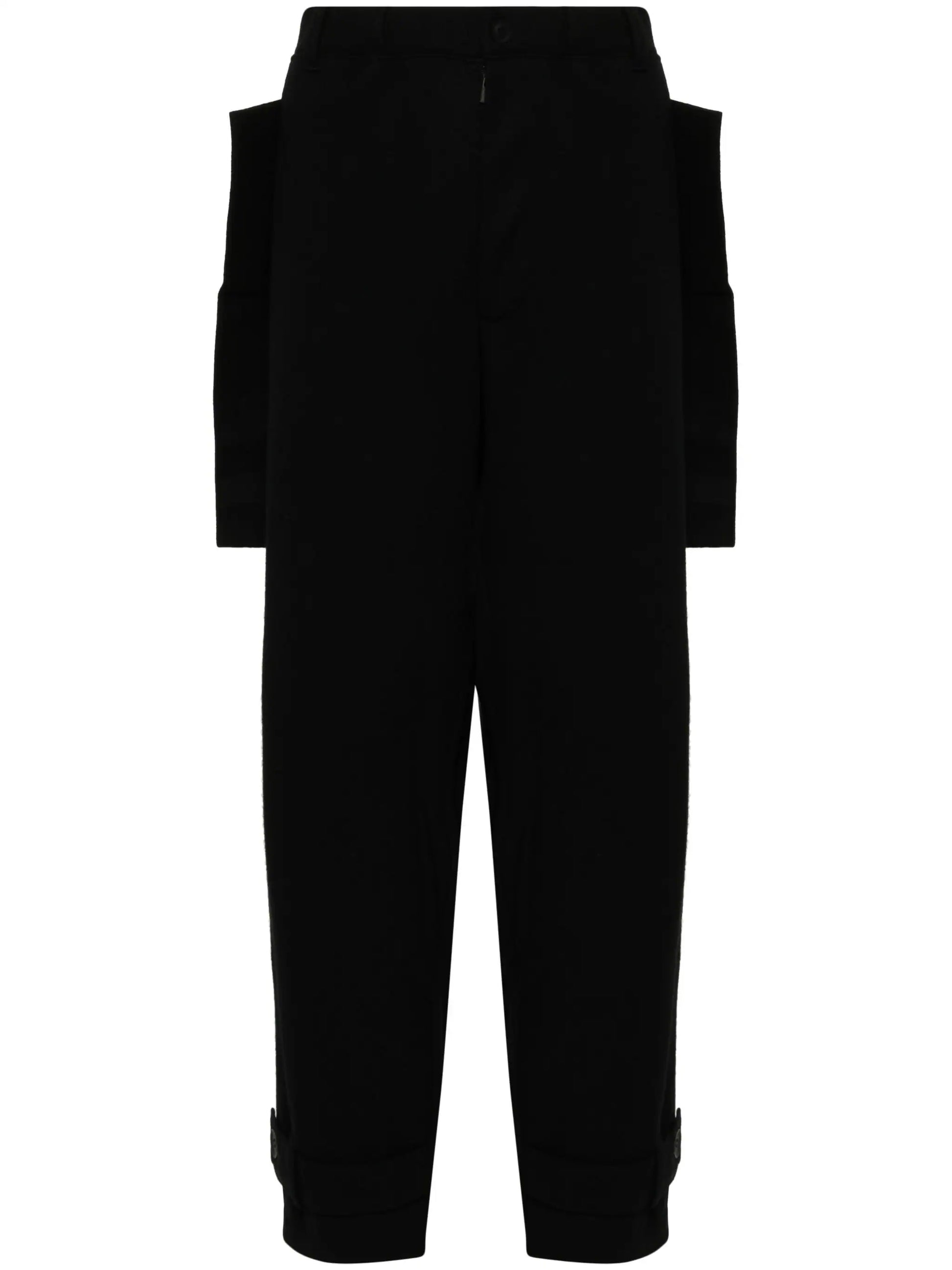 black wool blend belt loops two side slash pockets patch detail drop crotch button-fastening ankle strap two rear patch pockets elasticated drawstring waistband concealed fly and button fastening