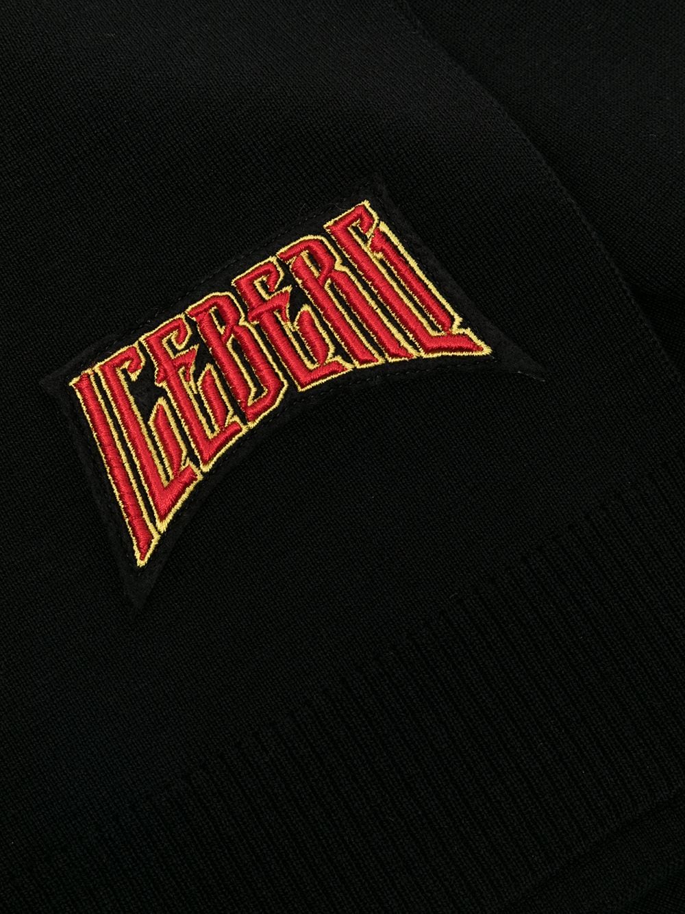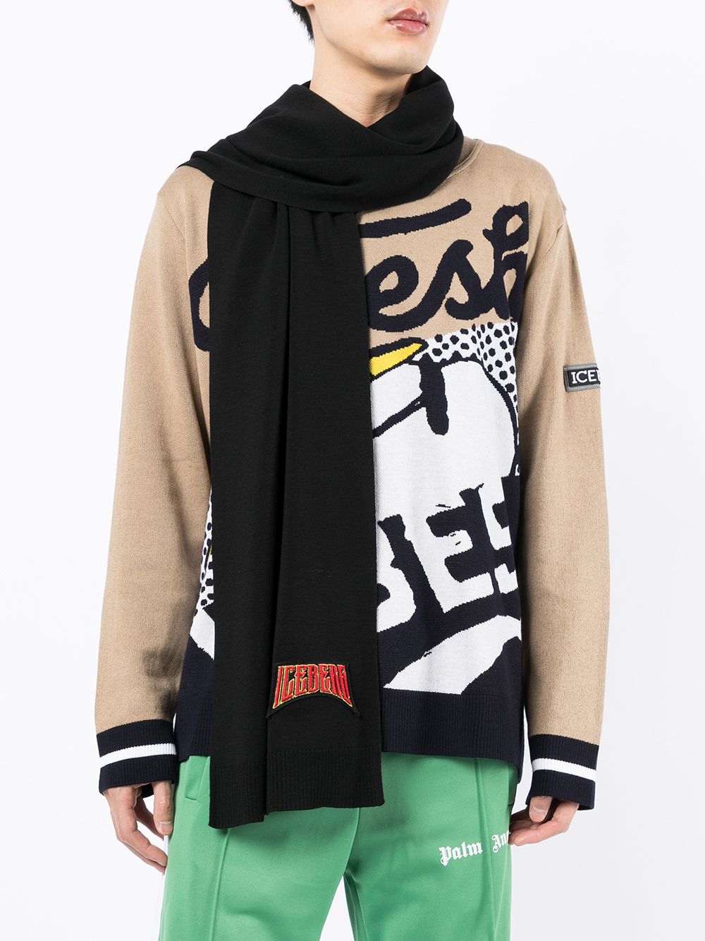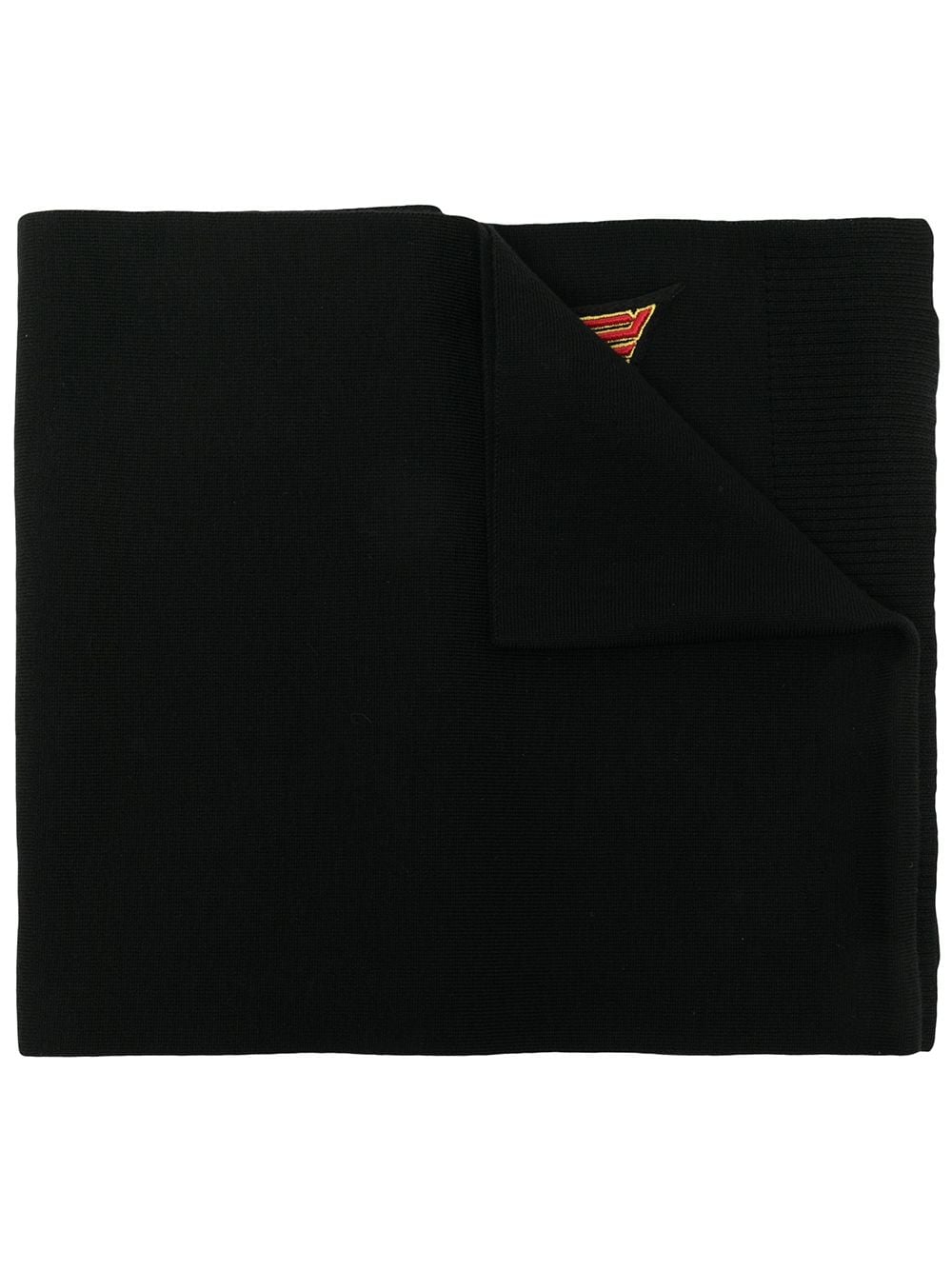 Black virgin wool embroidered-logo scarf from ICEBERG featuring fine knit, embroidered logo to the front and finished edge.