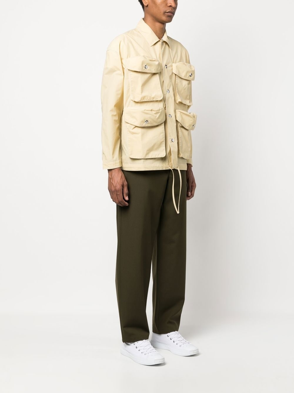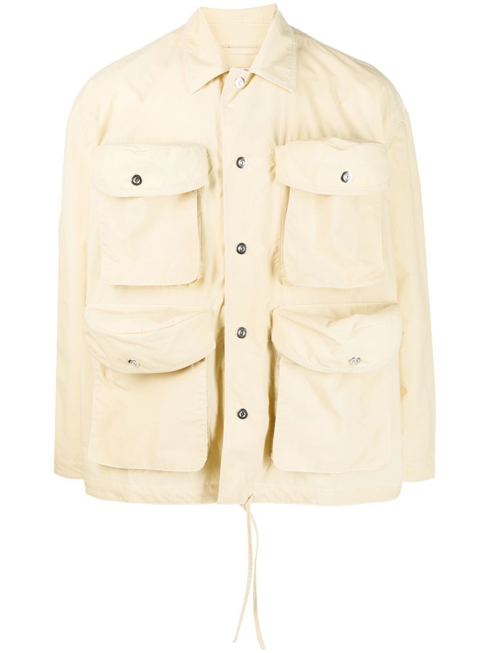 four pockets shirt from SUNNEI featuring front clasp fastening, four front patch pockets, classic collar, drop shoulder, drawstring hem, beige, long sleeves and unisex.