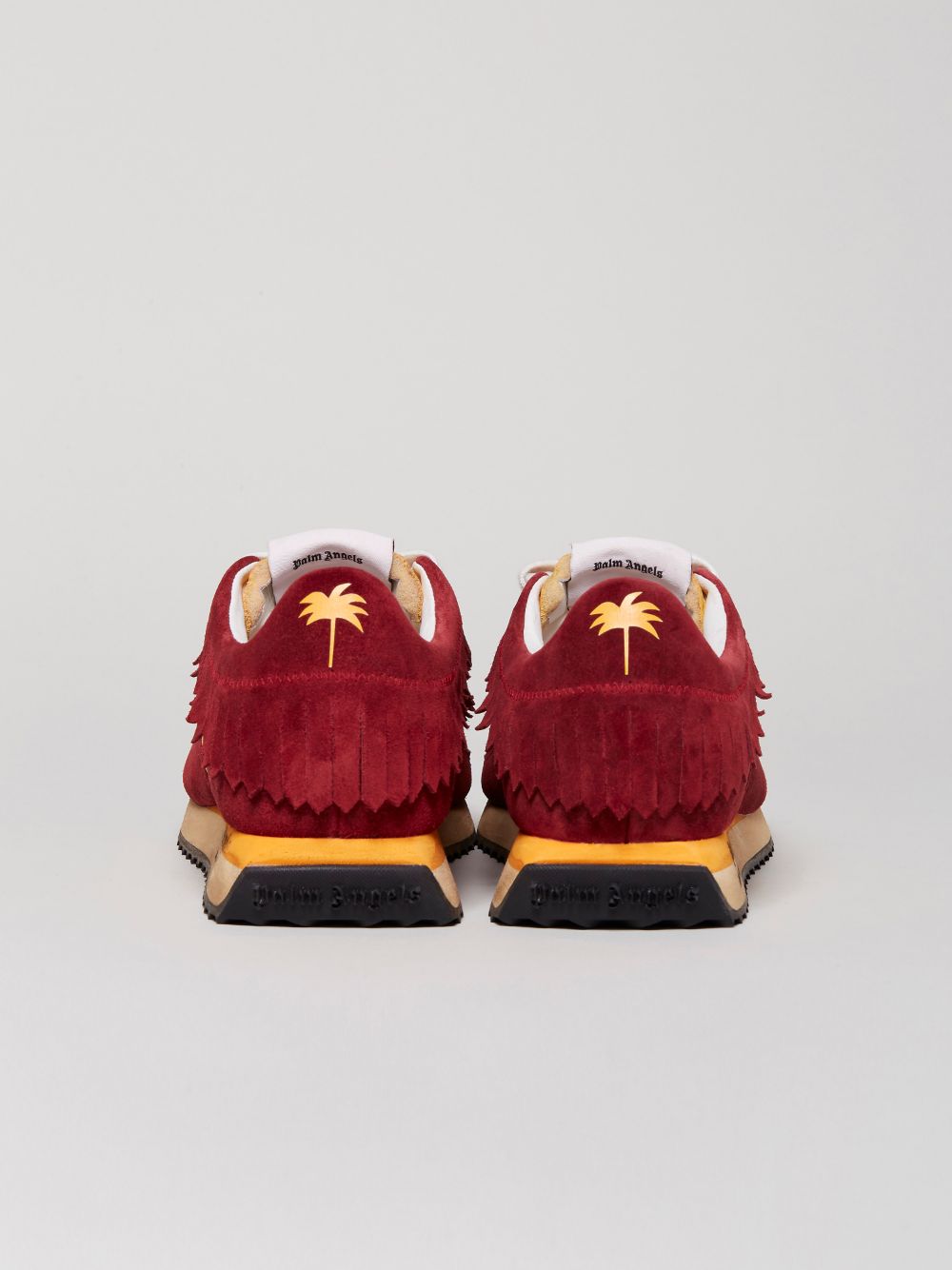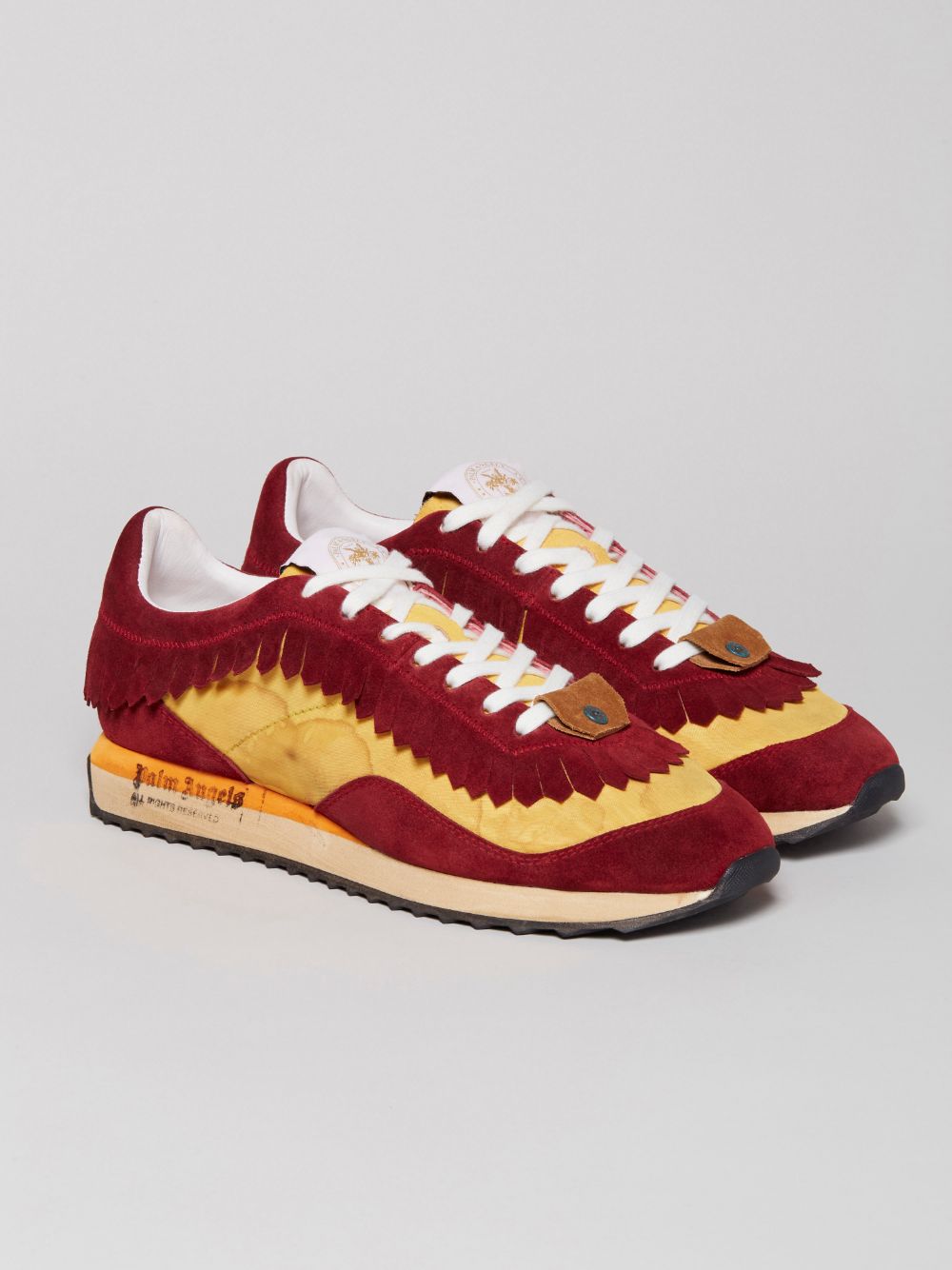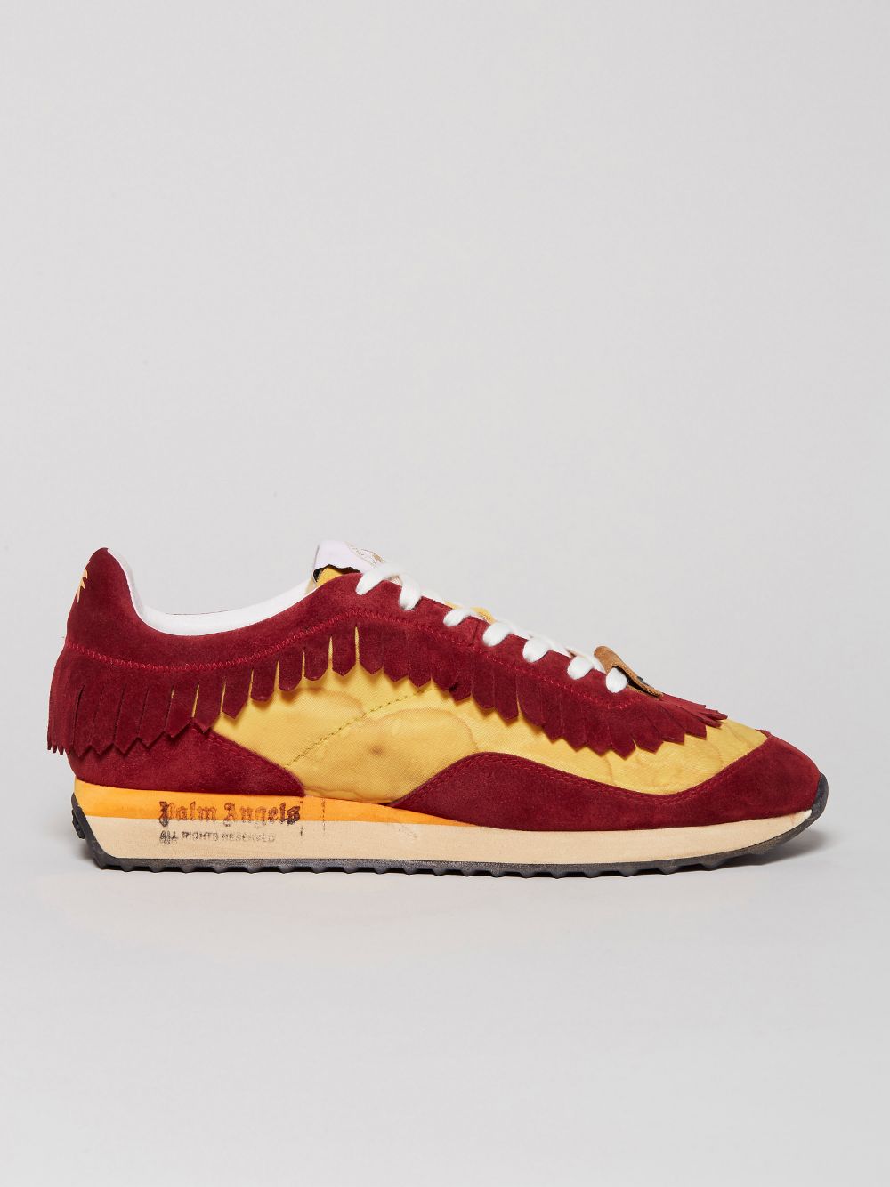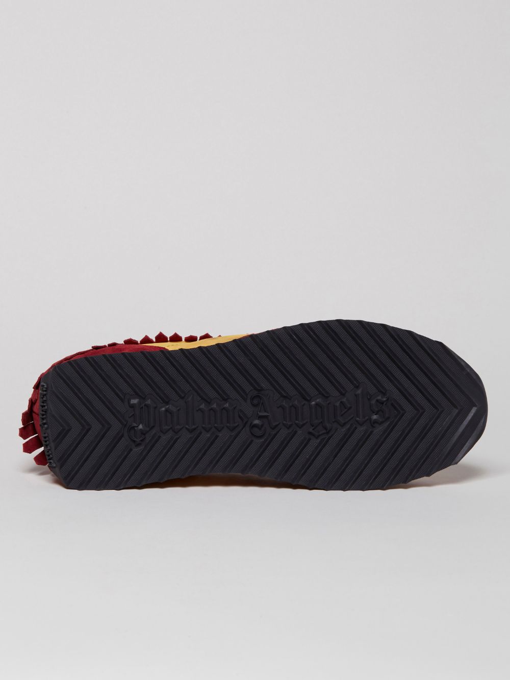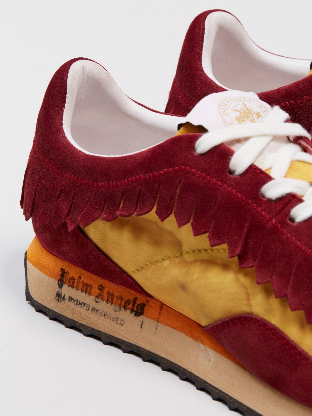 Burgundy/yellow leather Fringe Runner low-top sneakers from PALM ANGELS featuring fringe detailing, colour-block panelled design, front lace-up fastening, round toe, logo patch at the tongue, branded heel counter, flat rubber sole and branded insole.