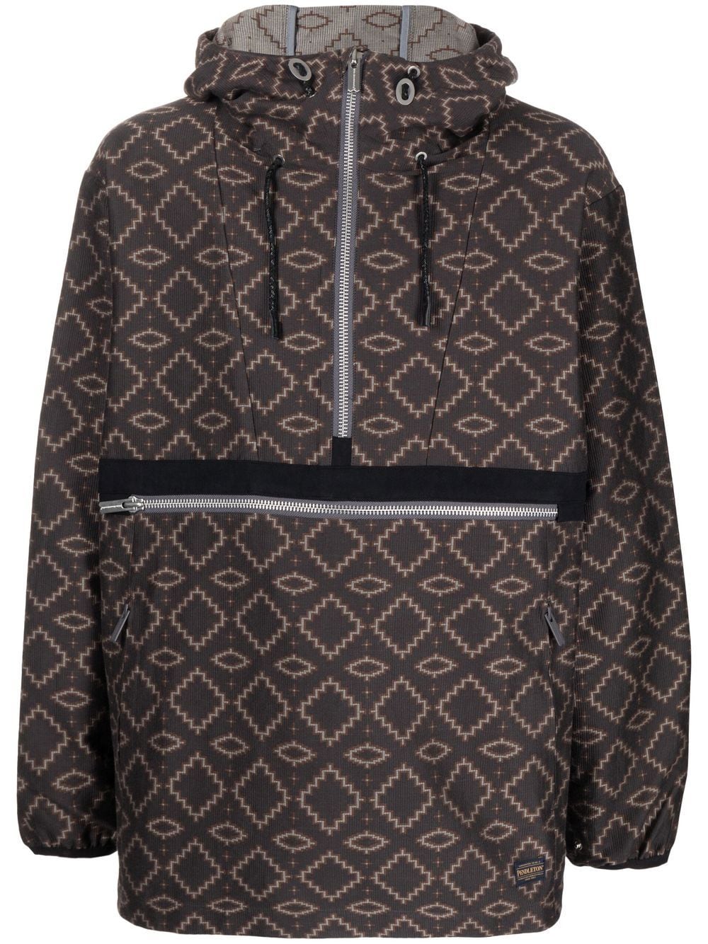 geometric pattern half-zipped jacket from WHITE MOUNTAINEERING featuring brown, cotton blend, geometric-pattern print, ribbed detailing, half front zip fastening, zip detail, two side zip-fastening pockets, logo patch to the side, side button fastening, drawstring hood, long sleeves and buttoned cuffs.