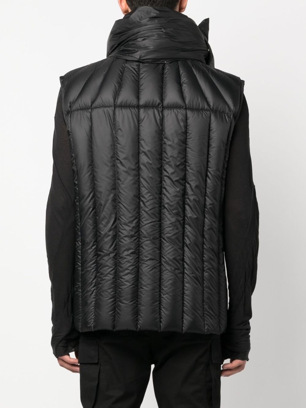Gimp detachable-neck padded gilet from Rick Owens featuring jet black, padded design, detachable neck strap, ribbed band collar, sleeveless, front zip fastening, two side inset pockets and straight hem.
