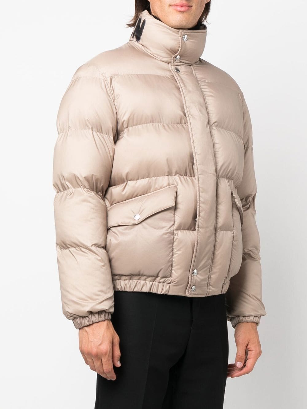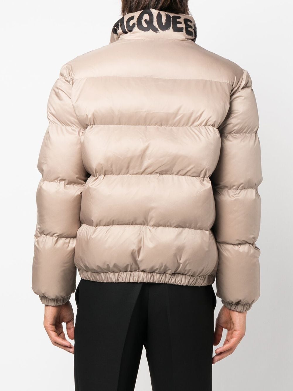 Graffiti-print puffer jacket from Alexander McQueen featuring taupe brown, black, signature Graffiti print, padded design, concealed front fastening, high neck, elasticated cuffs, elasticated hem, long sleeves and straight hem.