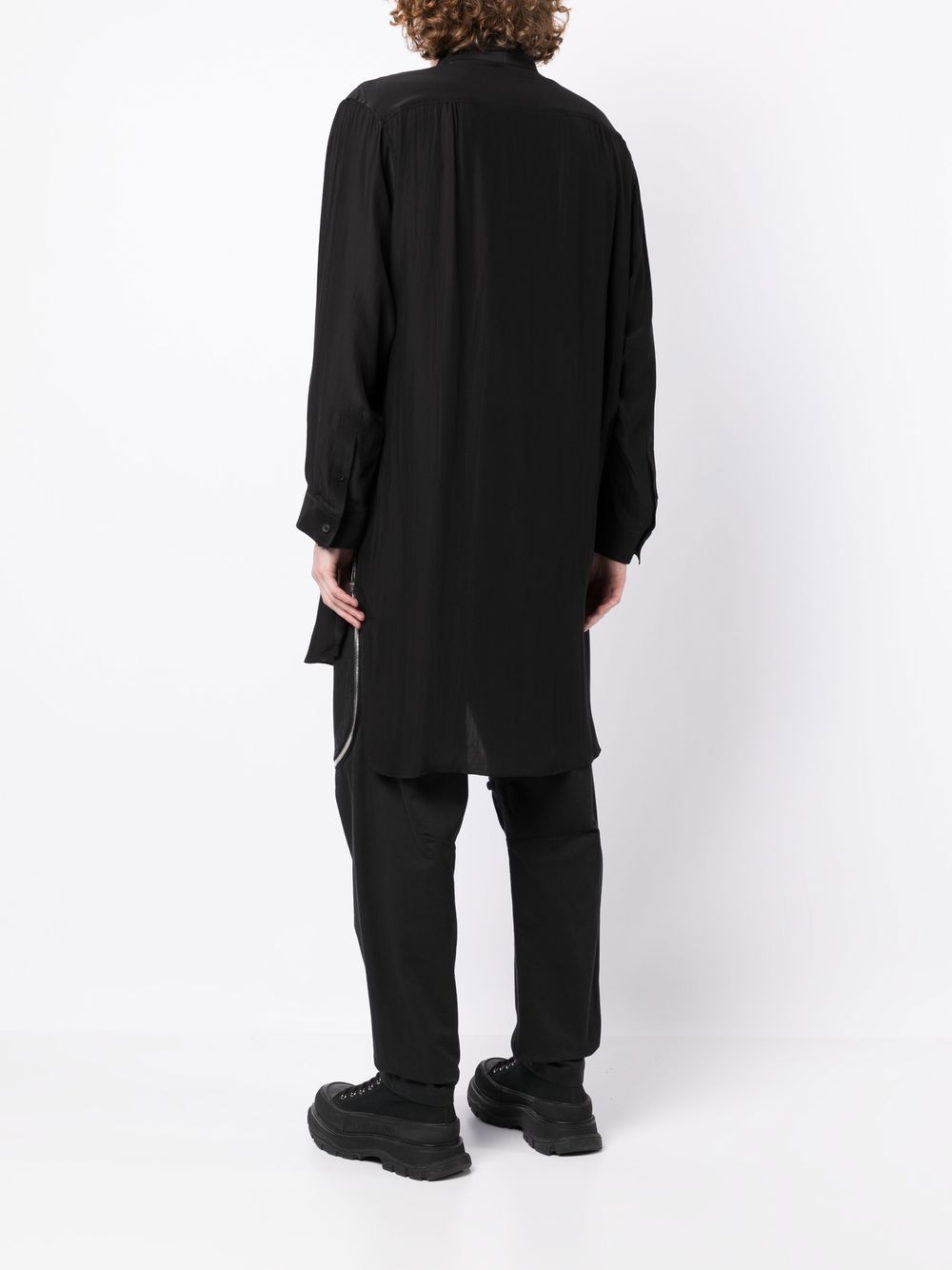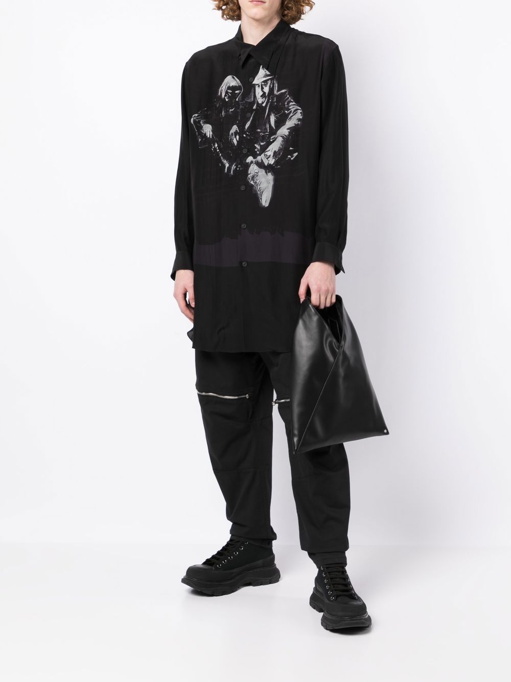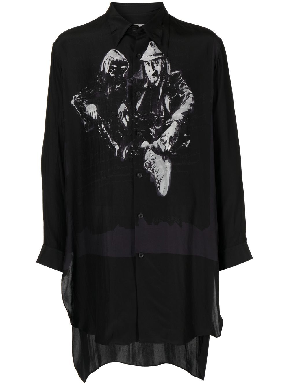 graphic-print cotton shirt from YOHJI YAMAMOTO featuring black, cotton, graphic print to the front, classic collar, front button fastening, long sleeves and rear curved hem.