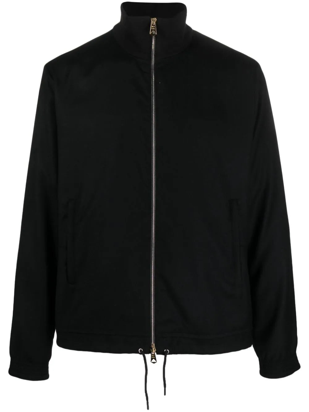 black wool-cashmere blend jersey texture ribbed stand-up collar front two-way zip fastening long sleeves fitted cuffs two side zip-fastening pockets internal slip pocket internal logo patch internal drawstring hem full lining