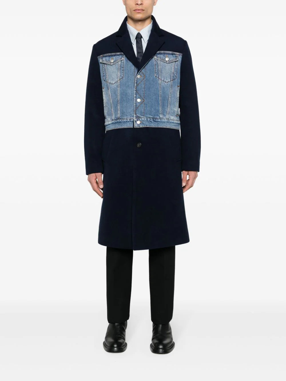 navy blue wool/cotton panelled design denim patchwork design notched lapels two chest flap pockets long sleeves two side welt pockets two side inset pockets straight hem multiple internal slip pockets full lining front button fastening
