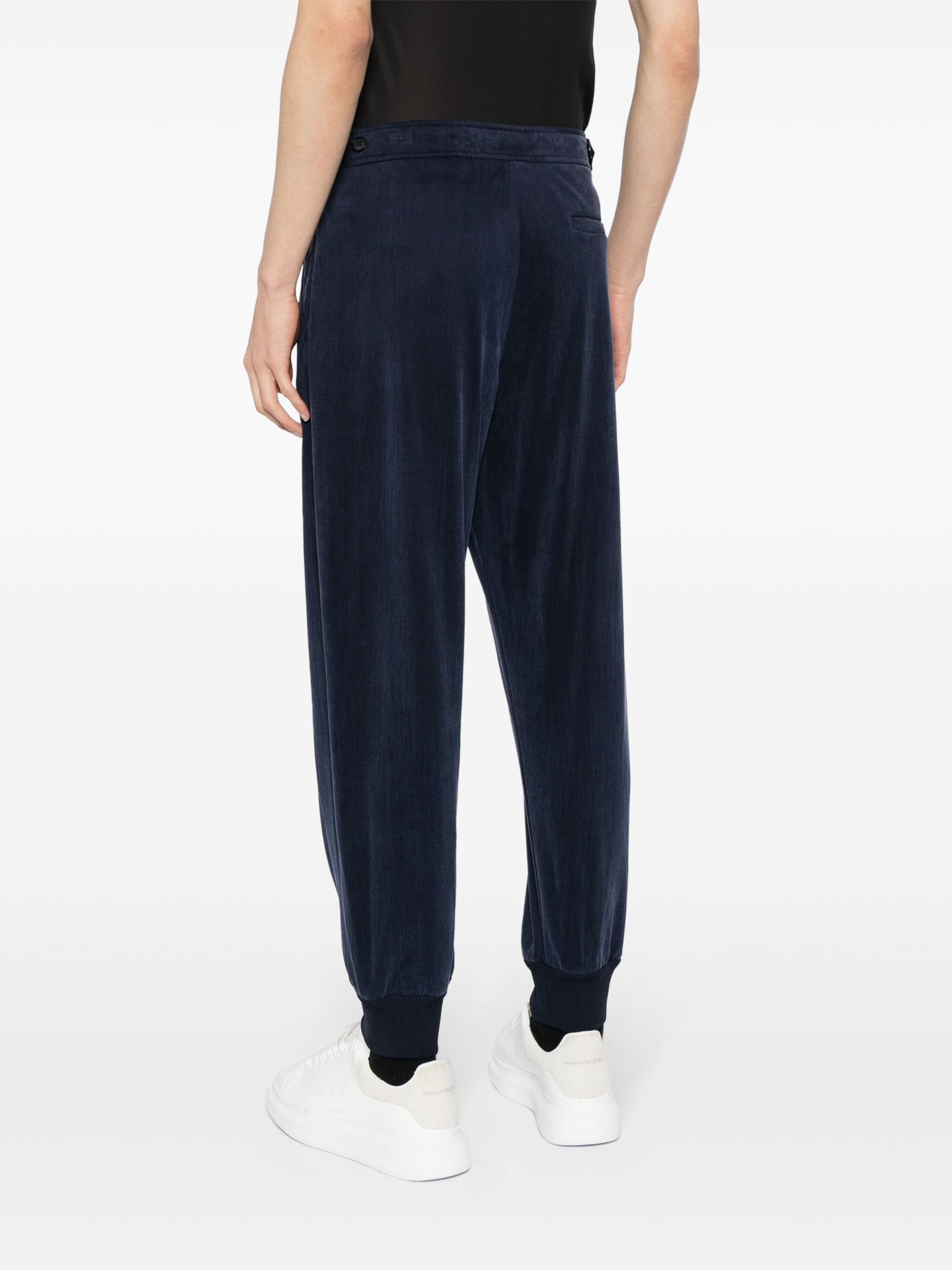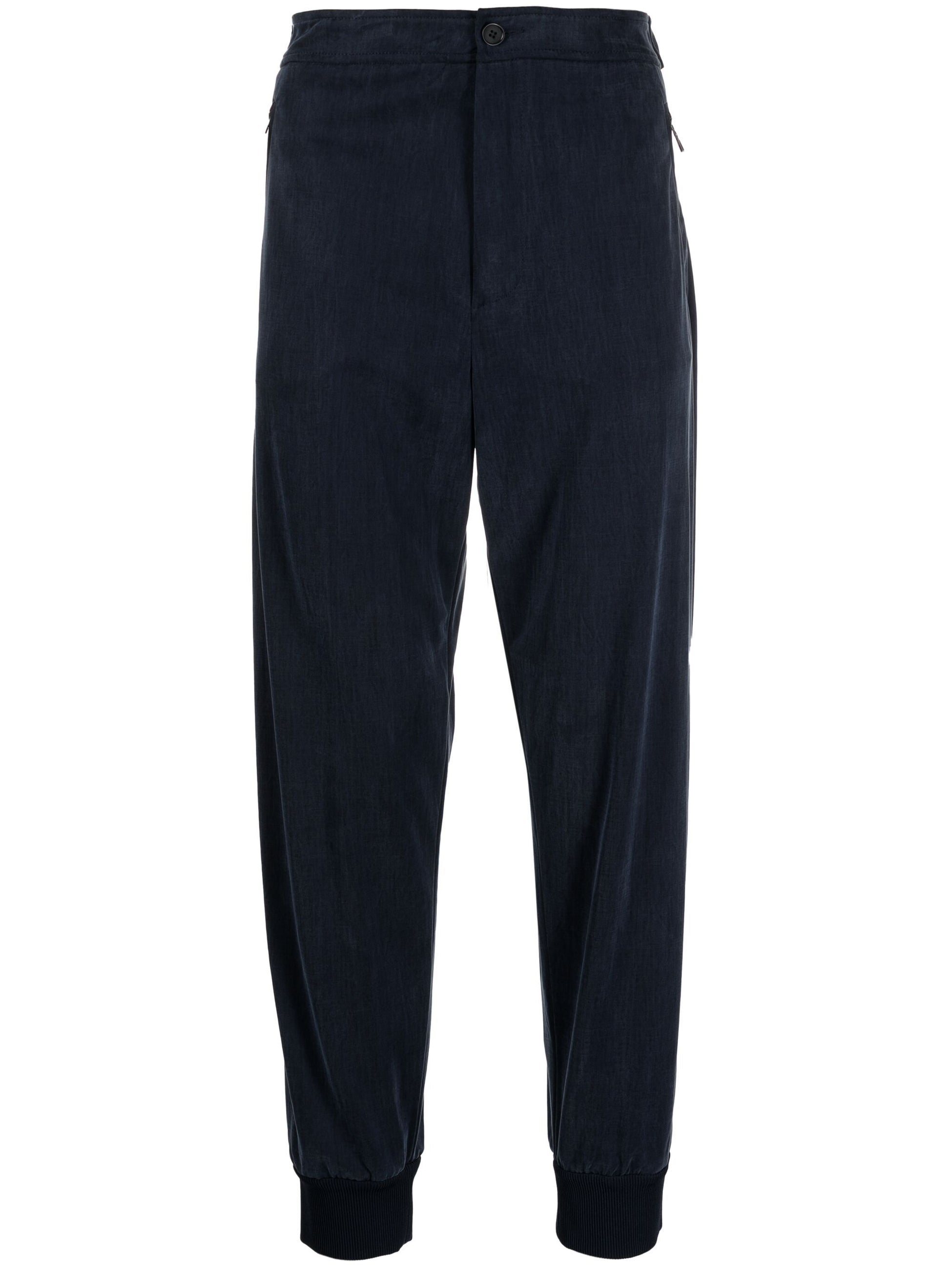 Expertly crafted with a navy blue jersey texture, our Tapered Track Pants offer both style and comfort. With a mid-rise, front button and zip fastening, two side zip-fastening pockets, and a rear welt pocket, these pants provide the perfect balance of functionality and fashion. The tapered leg and elasticated ankles ensure a sleek and modern silhouette.