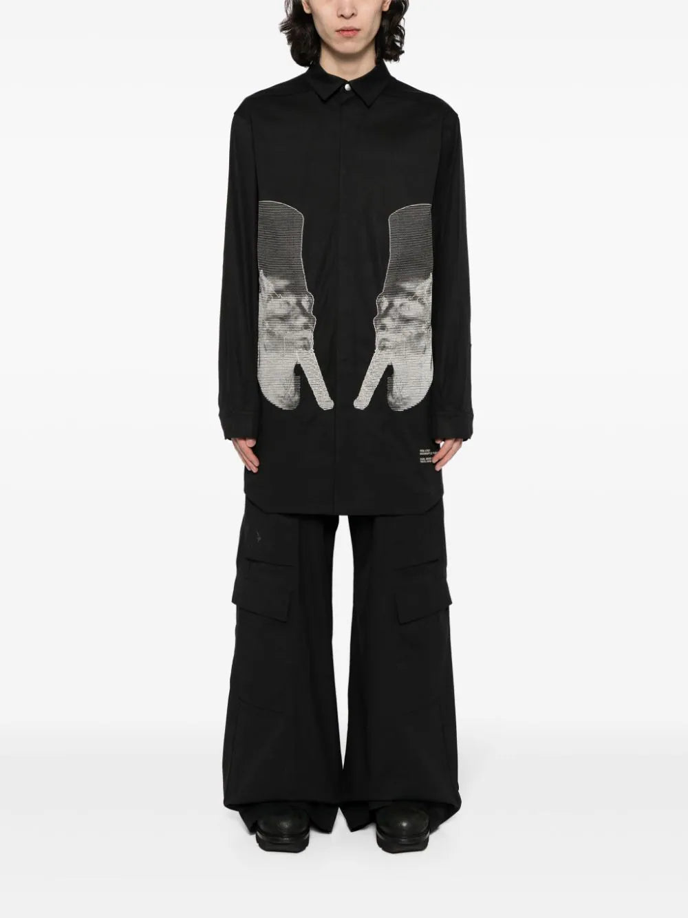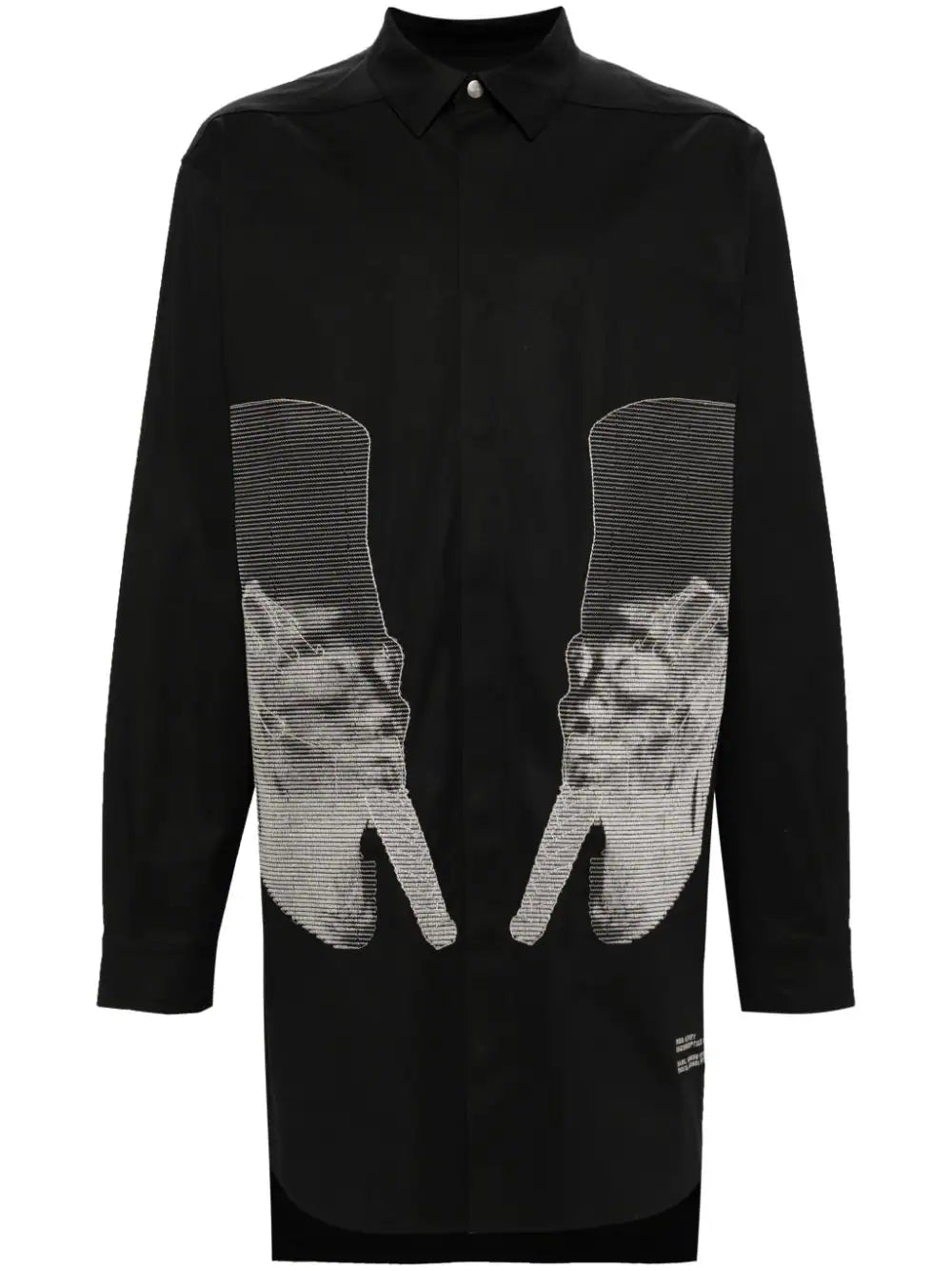 black stretch-cotton classic collar concealed front fastening long sleeves embroidered design curved hem thigh-length