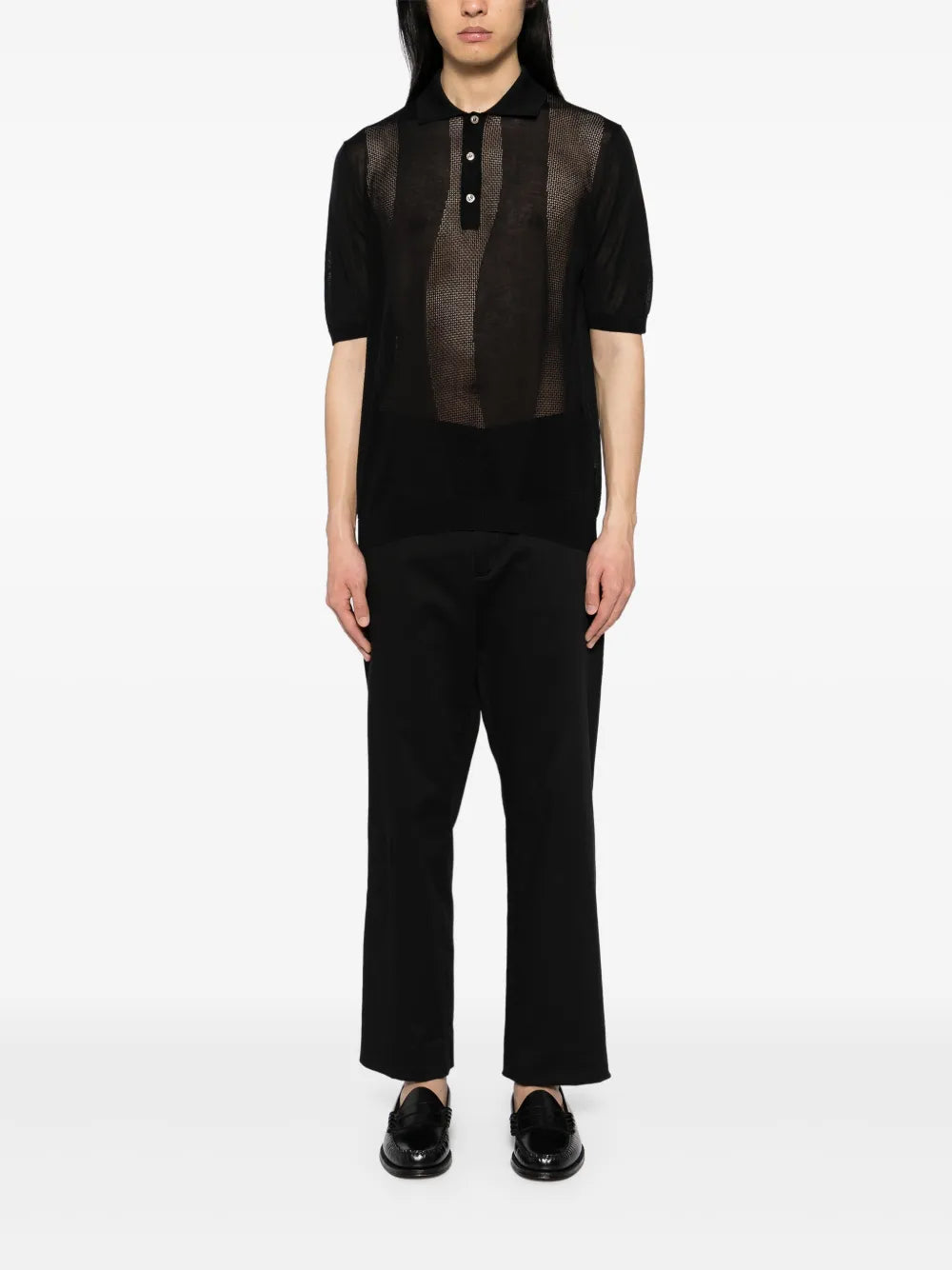 The Knitted Polo Shirt is expertly crafted with a short front button fastening, polo collar, and ribbed cuffs and hem, providing both style and comfort. The sleek black color adds a versatile touch to any wardrobe. The perfect balance of function and fashion.
