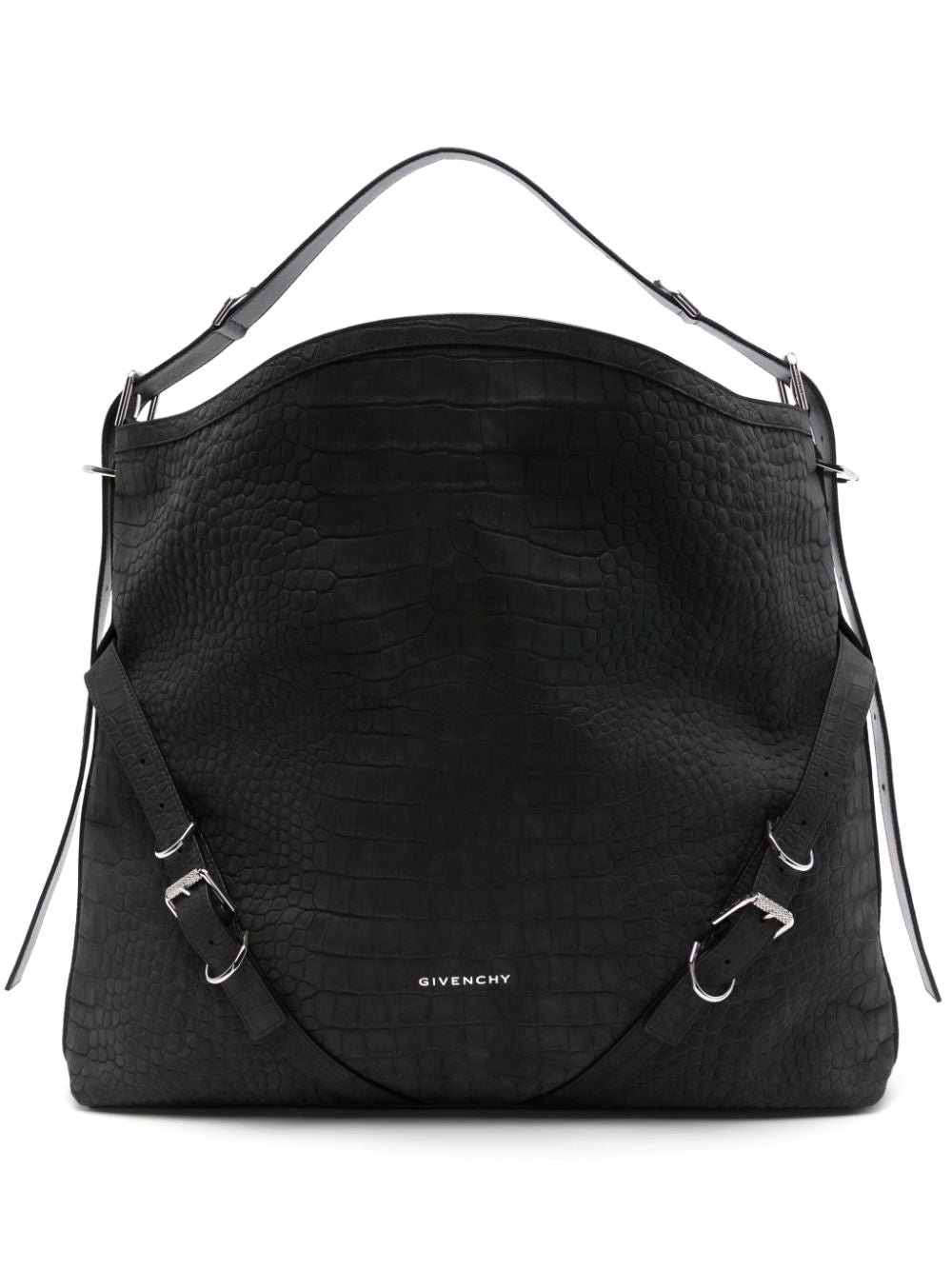 Expertly crafted from luxurious black calf leather, the Large Voyou Shoulder Bag boasts an embossed crocodile effect with a sleek matte finish. The iconic logo stamp and buckle-embellished shoulder straps add a touch of sophistication. With an adjustable and detachable shoulder strap, this elegant bag offers versatility and practicality. The spacious main compartment includes an internal zip-fastening pocket and logo patch for added organization. Elevate your style with this timeless and functional accessory.