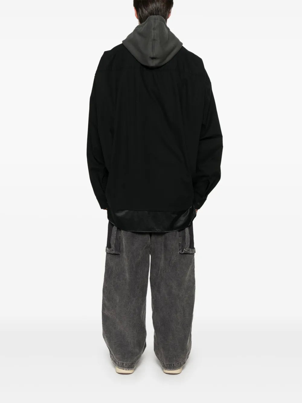 This layered jacket features a black/grey front press-stud and zip fastening, along with a drawstring hood and multiple pockets for added functionality. The perfect addition to any wardrobe for those seeking both style and practicality.