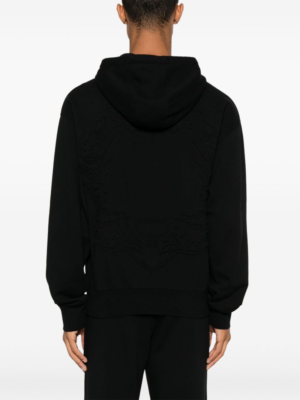 black cotton jersey texture embossed logo to the front drawstring hood front pouch pocket embossed detailing to the rear drop shoulder long sleeves elasticated cuffs fleece lining elasticated hem