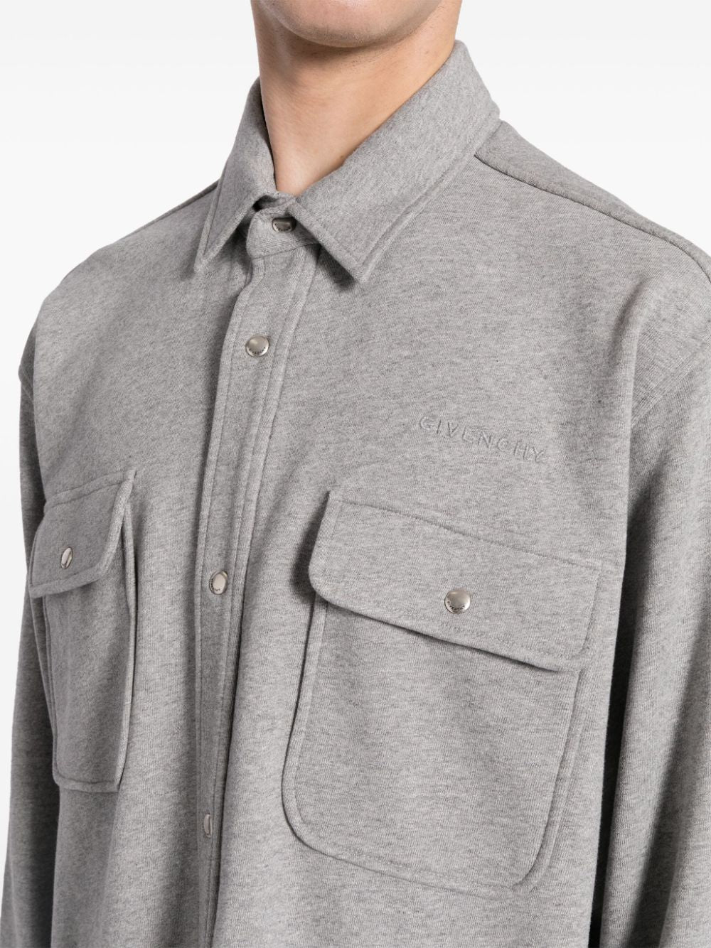 heather grey cotton jersey texture mélange effect classic collar front press-stud fastening chest flap pockets long sleeves press-stud fastening cuffs straight hem
