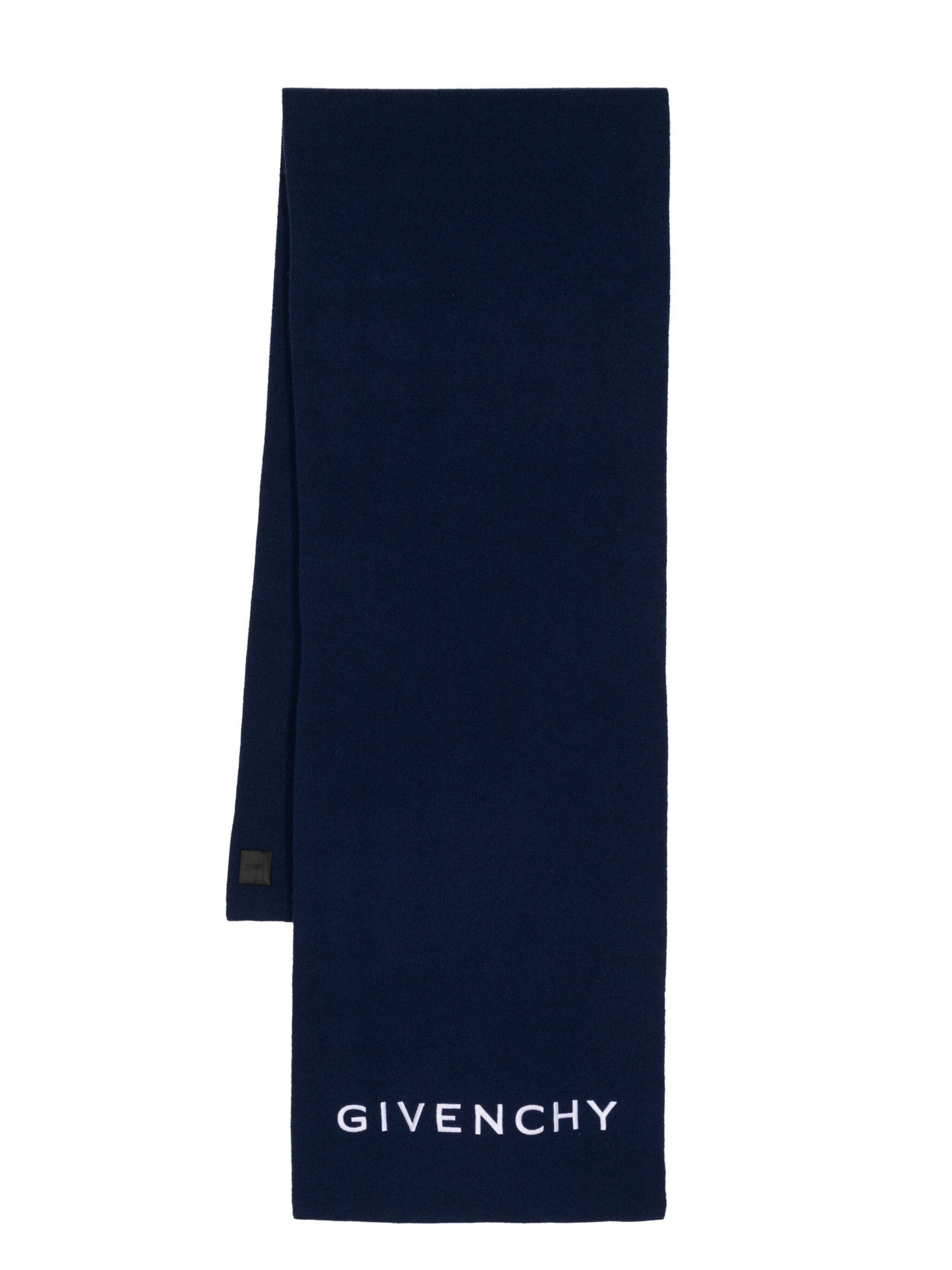 navy blue wool-cashmere blend fine knit embroidered logo to the front finished edge rectangle shape wraparound style