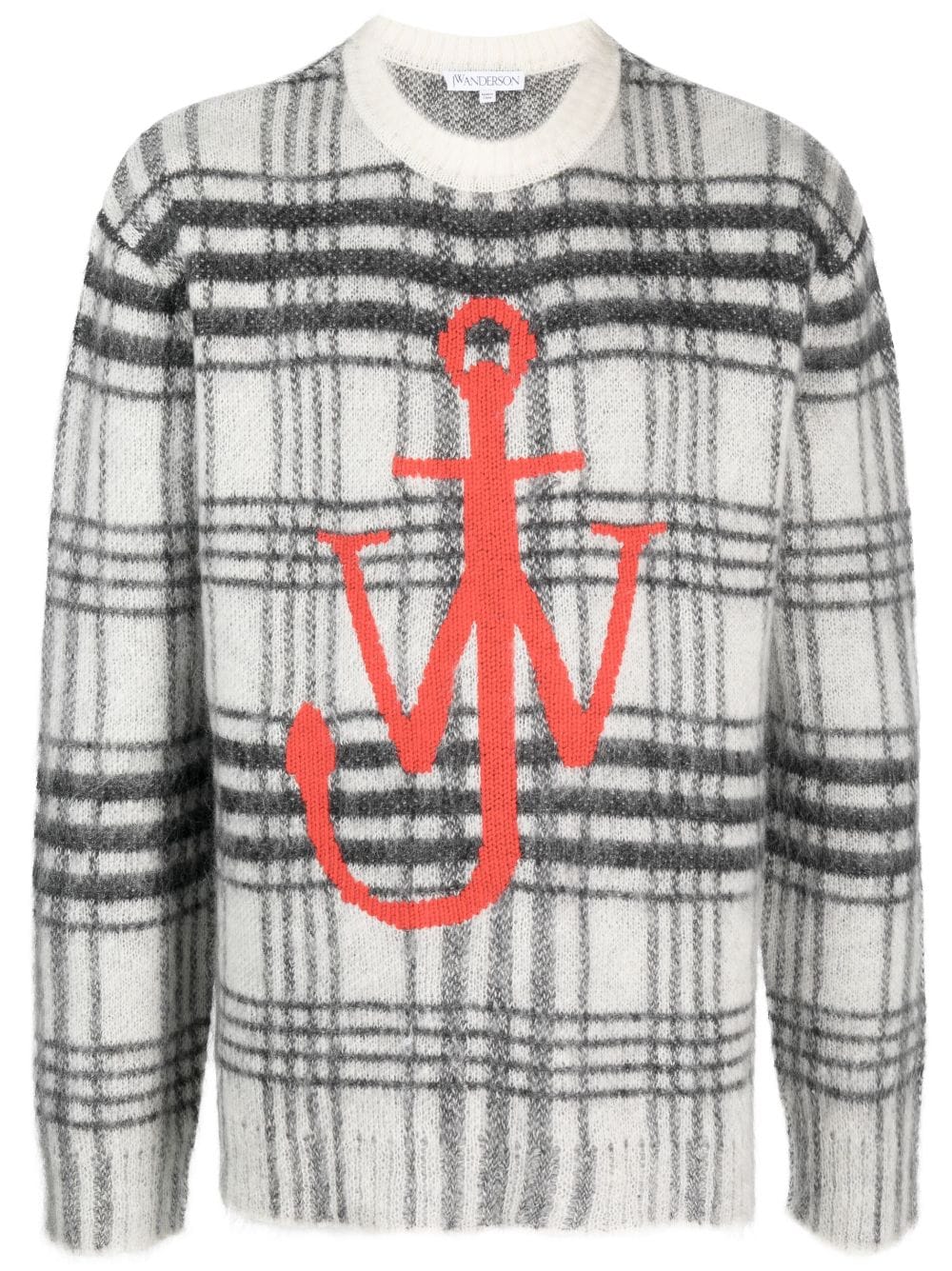 logo-intarsia tartan jumper from JW Anderson featuring white/black, orange, checked intarsia knit, signature JW-initials anchor logo, round neck, long sleeves, straight hem and ribbed cuffs and hem.