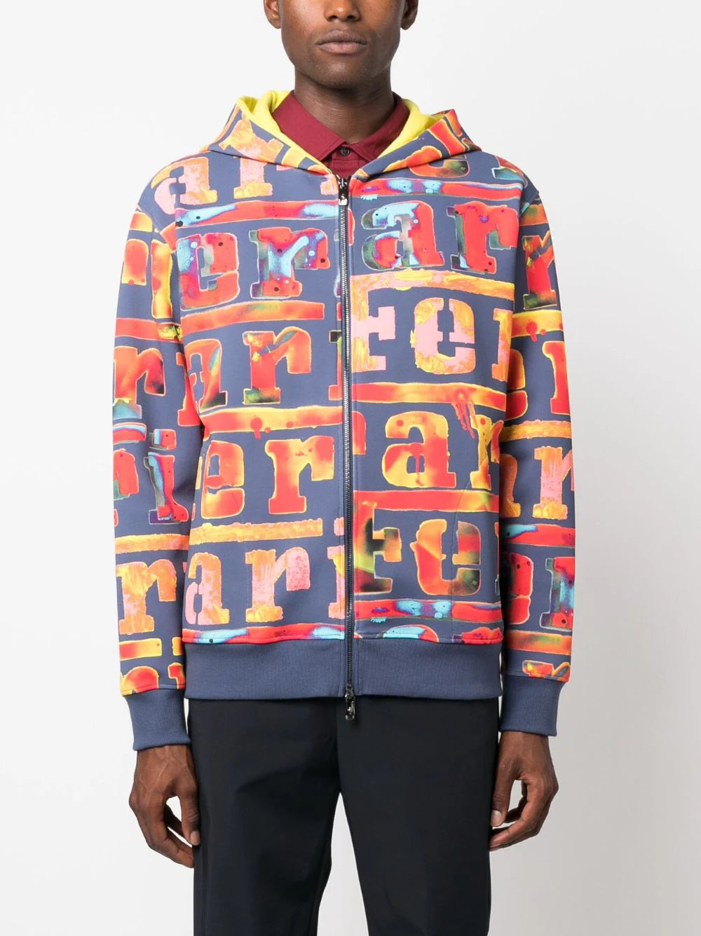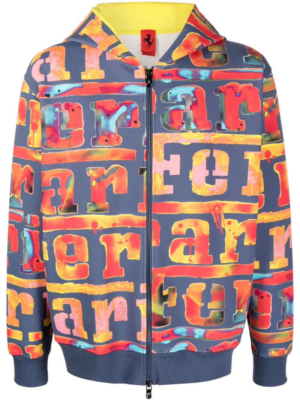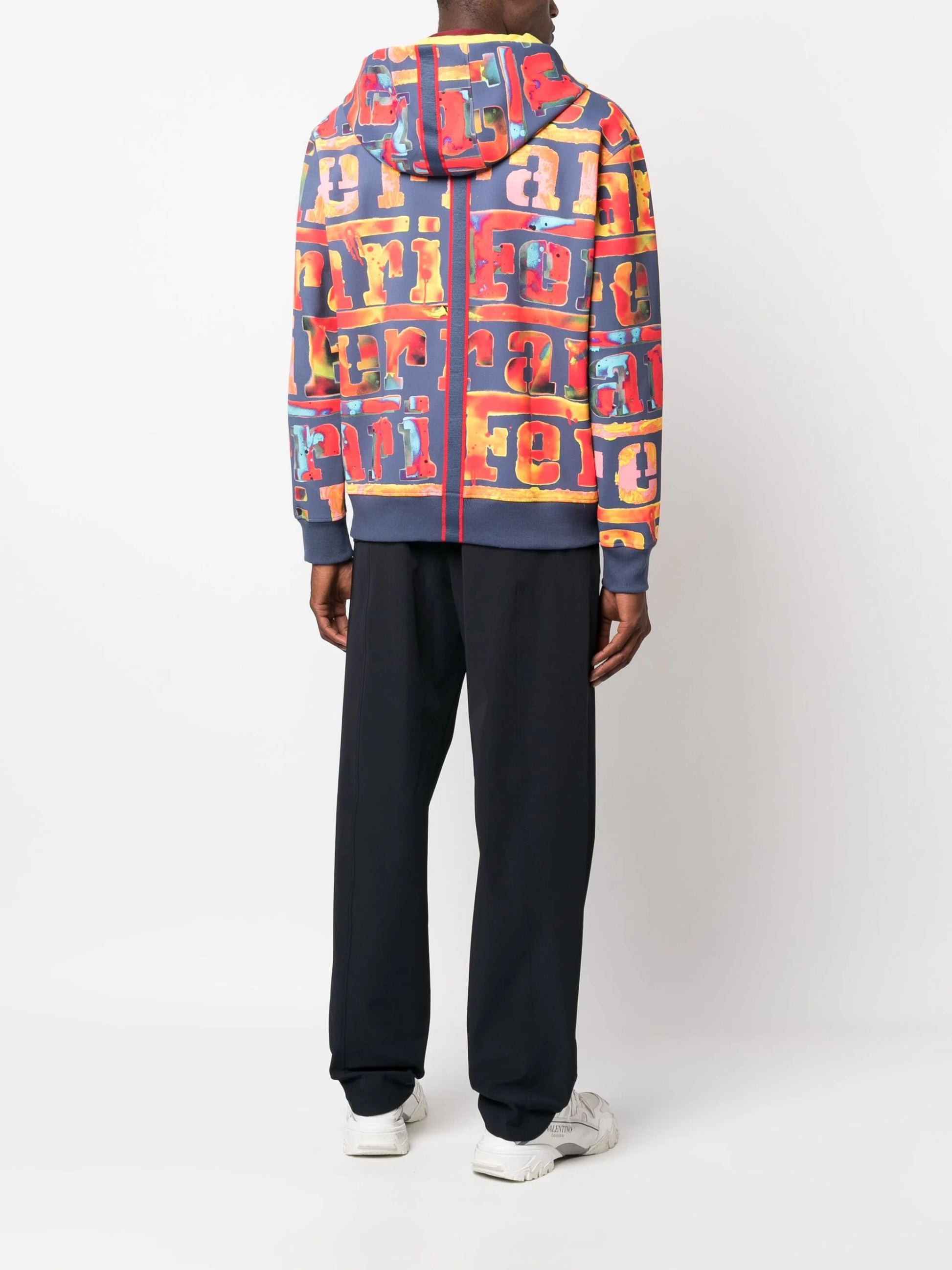navy blue/bright red/canary yellow twill weave painterly logo print grosgrain ribbon trim long sleeves front two-way zip fastening slouchy hood two side slash pockets ribbed cuffs and hem