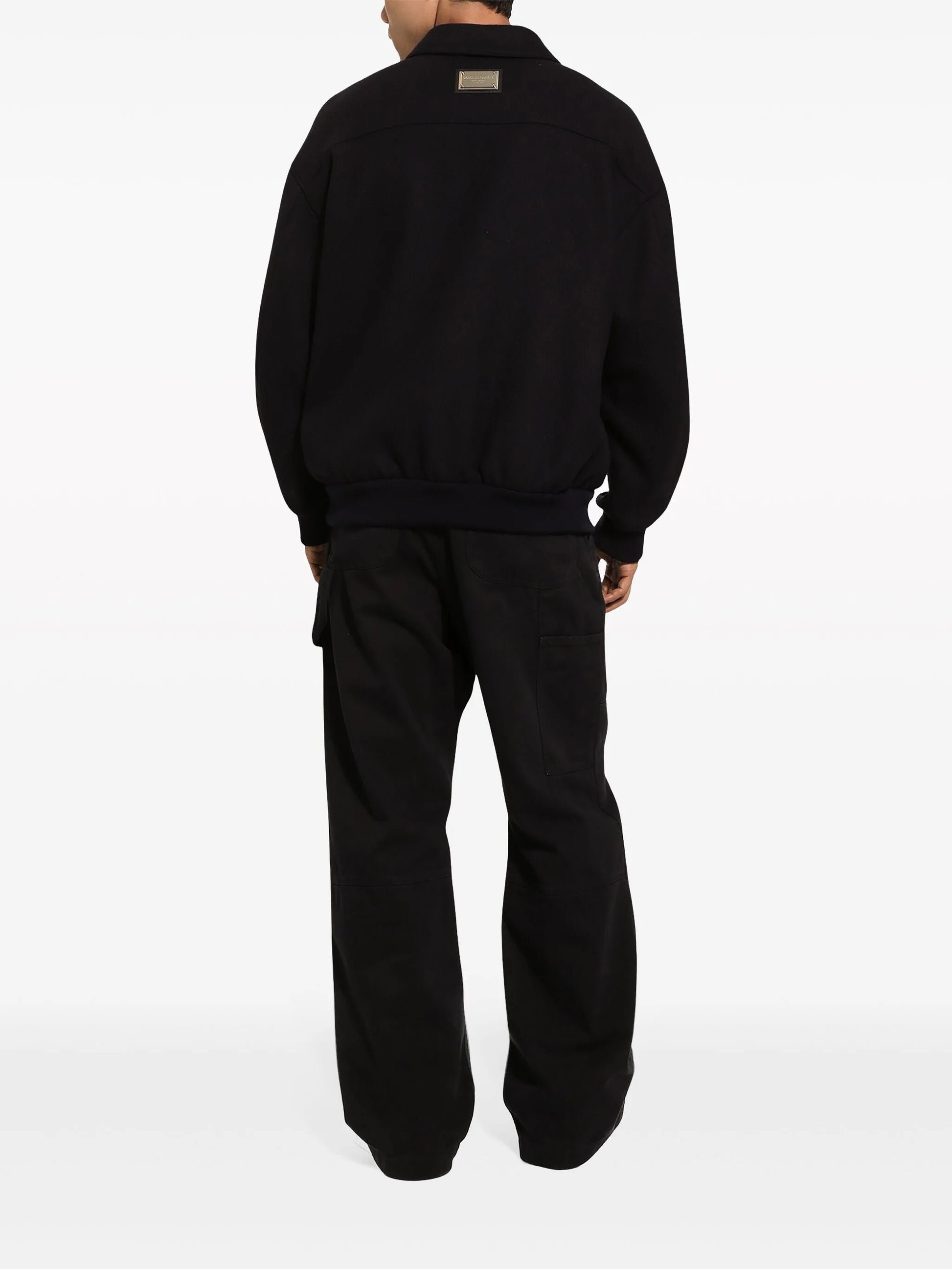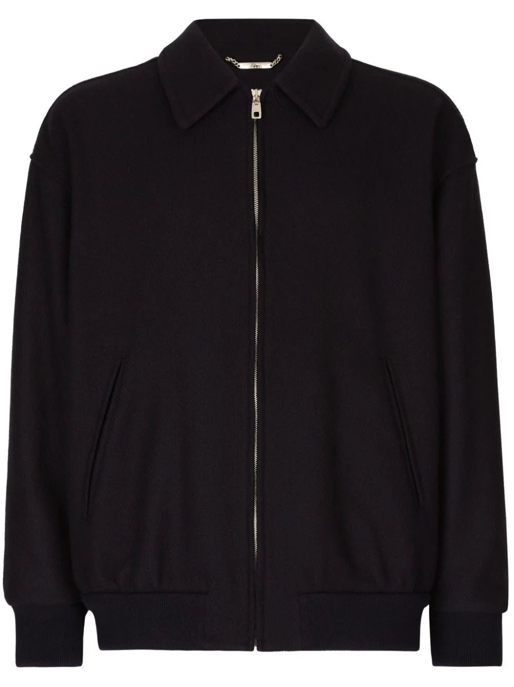 midnight blue virgin wool blend logo plaque classic collar front zip fastening drop shoulder long sleeves ribbed cuffs and hem two side welt pockets straight hem