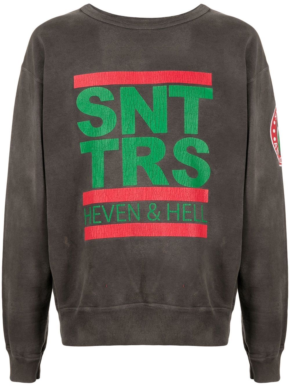 logo-print crew-neck sweatshirt from SAINT MXXXXXX featuring dark grey, dark green, bright red, cotton, graphic print to the front, logo print at the sleeve, crew neck, long sleeves and straight hem.