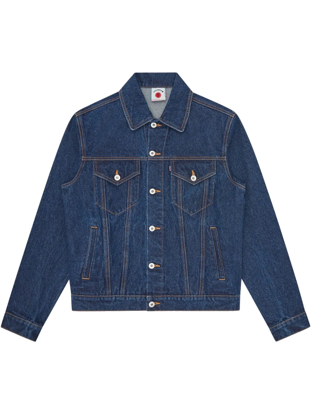 This indigo blue denim jacket features a front button fastening, two button-fastening chest pockets, and two side slit pockets. The logo print on the rear adds a touch of style and branding. Stay on-trend and fashionable with this versatile and functional jacket.