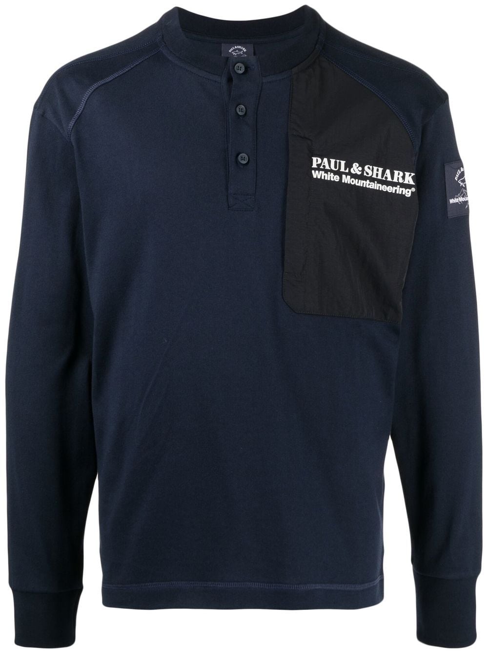 logo-print panelled T-Shirt from WHITE MOUNTAINEERING featuring navy blue, cotton, jersey knit, panelled design, logo print to the front, logo patch at the sleeve, crew neck, long sleeves, fitted-cuff sleeves and straight hem.