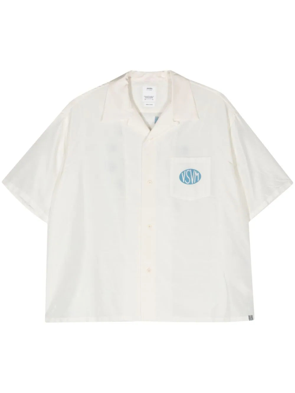 off-white silk logo print at the chest and rear camp collar front button fastening drop shoulder short sleeves chest patch pocket straight hem