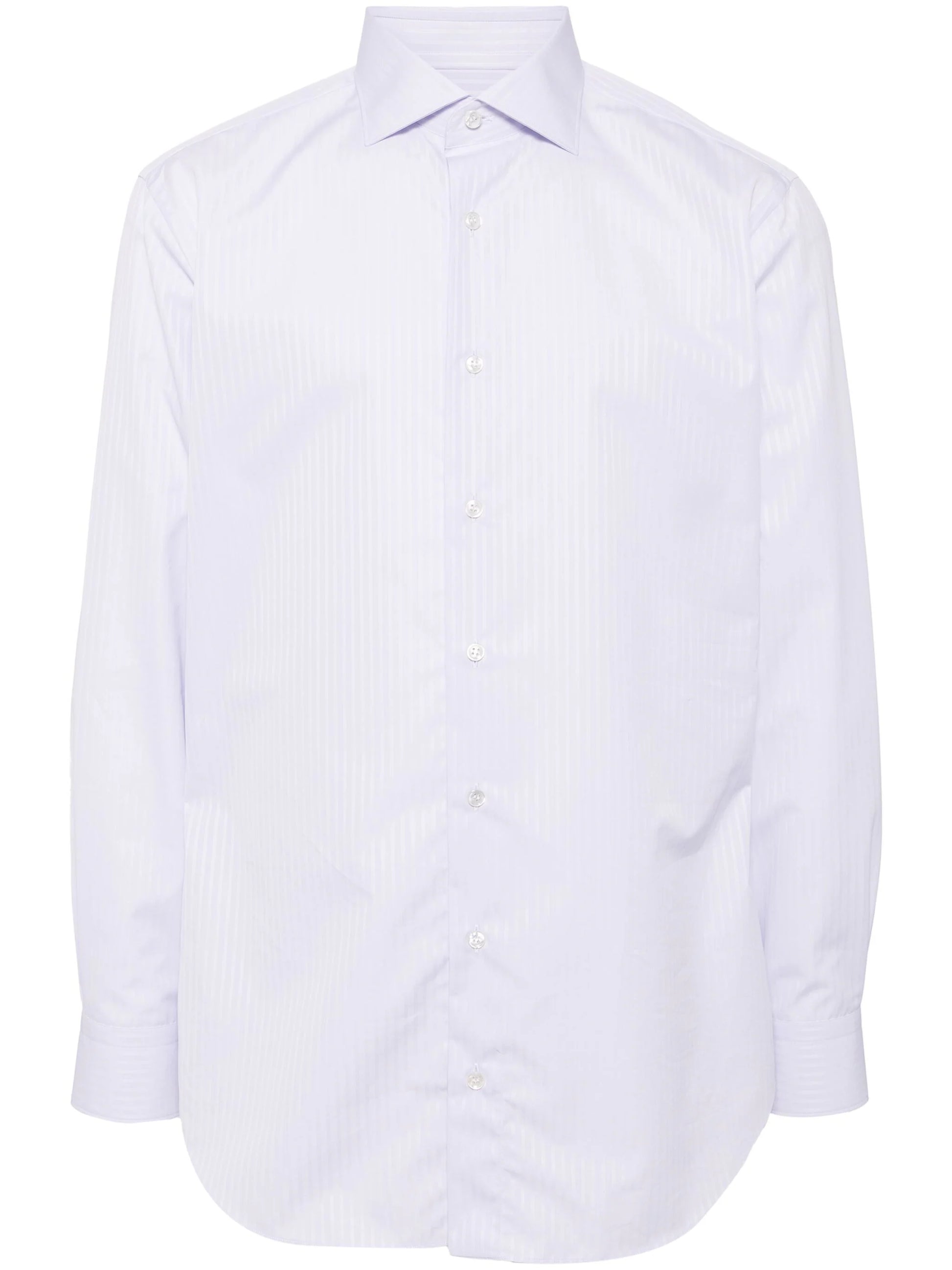 lilac purple cotton pinstripe pattern classic collar button fastening buttoned cuffs long sleeves curved hem