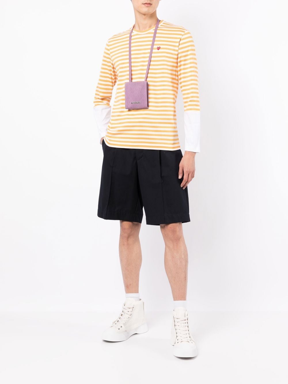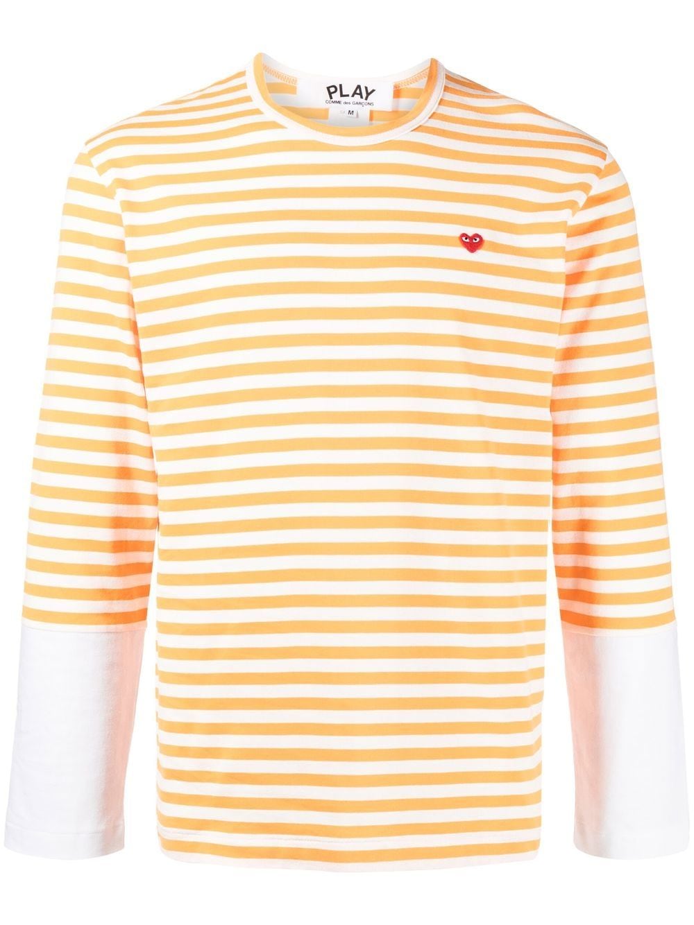 long-sleeve striped T-shirt from COMME DES GARÇONS PLAY featuring yellow, white, cotton, horizontal stripe pattern, signature heart patch, long sleeves, round neck and straight hem.