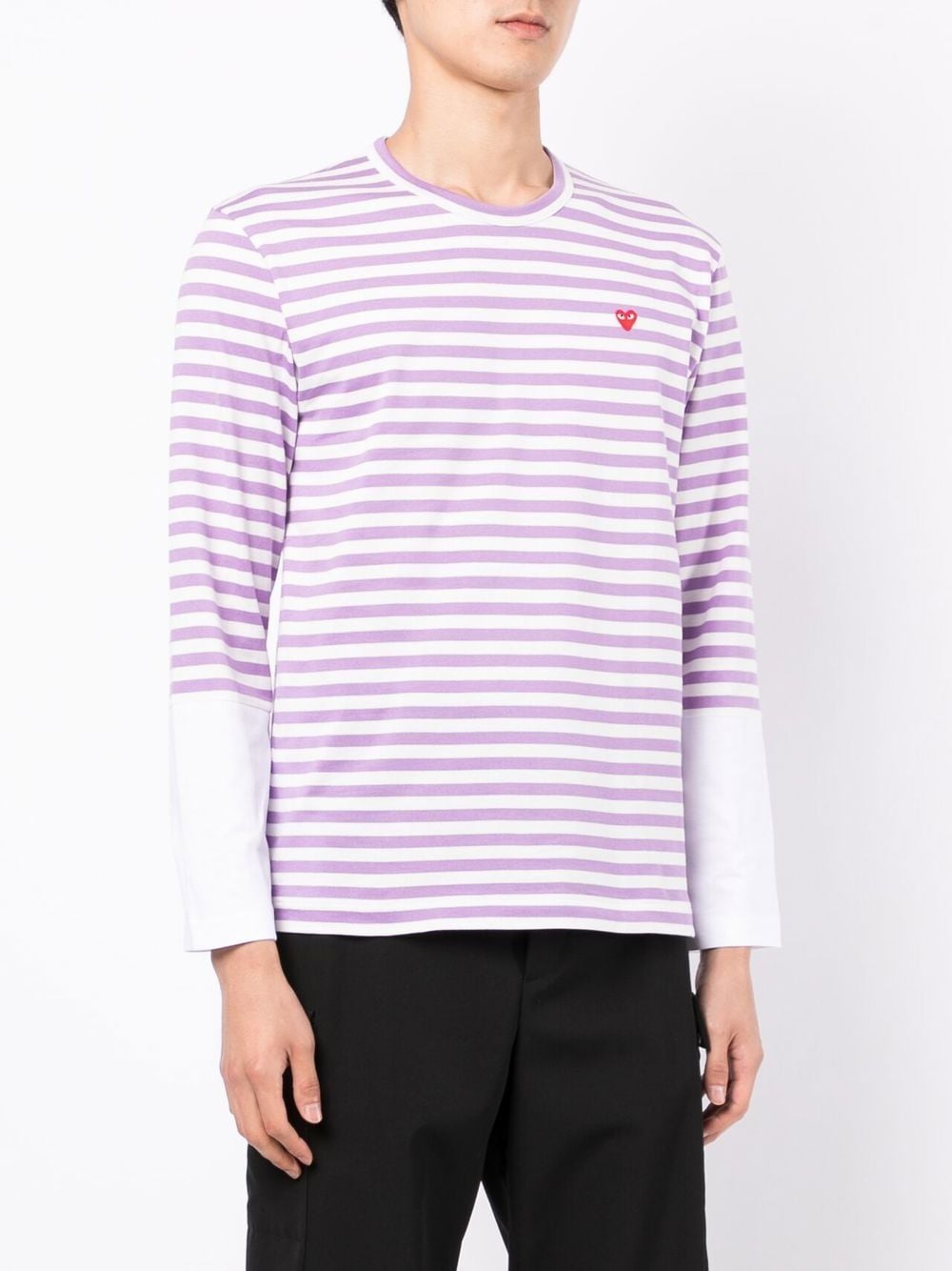 long-sleeve striped T-shirt from COMME DES GARÇONS PLAY featuring purple, white, cotton, horizontal stripe pattern, signature heart patch, long sleeves, round neck and straight hem.
