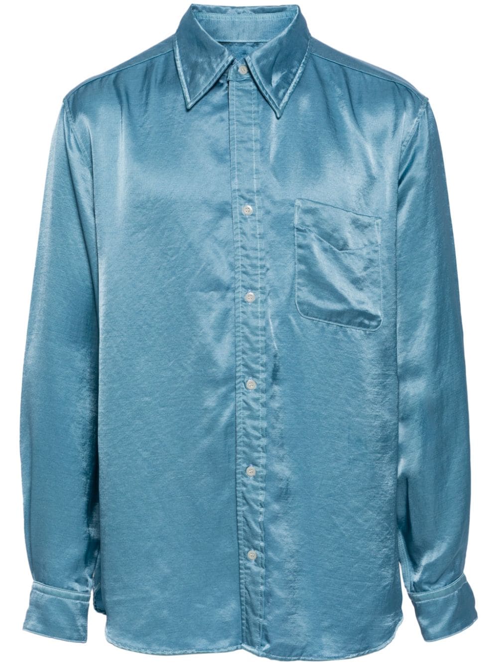 sky blue satin finish classic collar front button fastening appliqué detail long sleeves buttoned cuffs curved hem