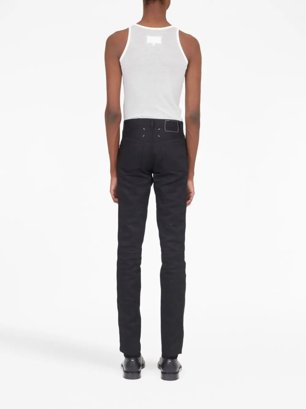 Memory-of five-pocket jeans from Maison Margiela featuring black, cotton blend, denim, stretch-design, signature four-stitch logo, contrast stitching, belt loops, front button and zip fastening, classic five pockets, straight leg and straight hem.