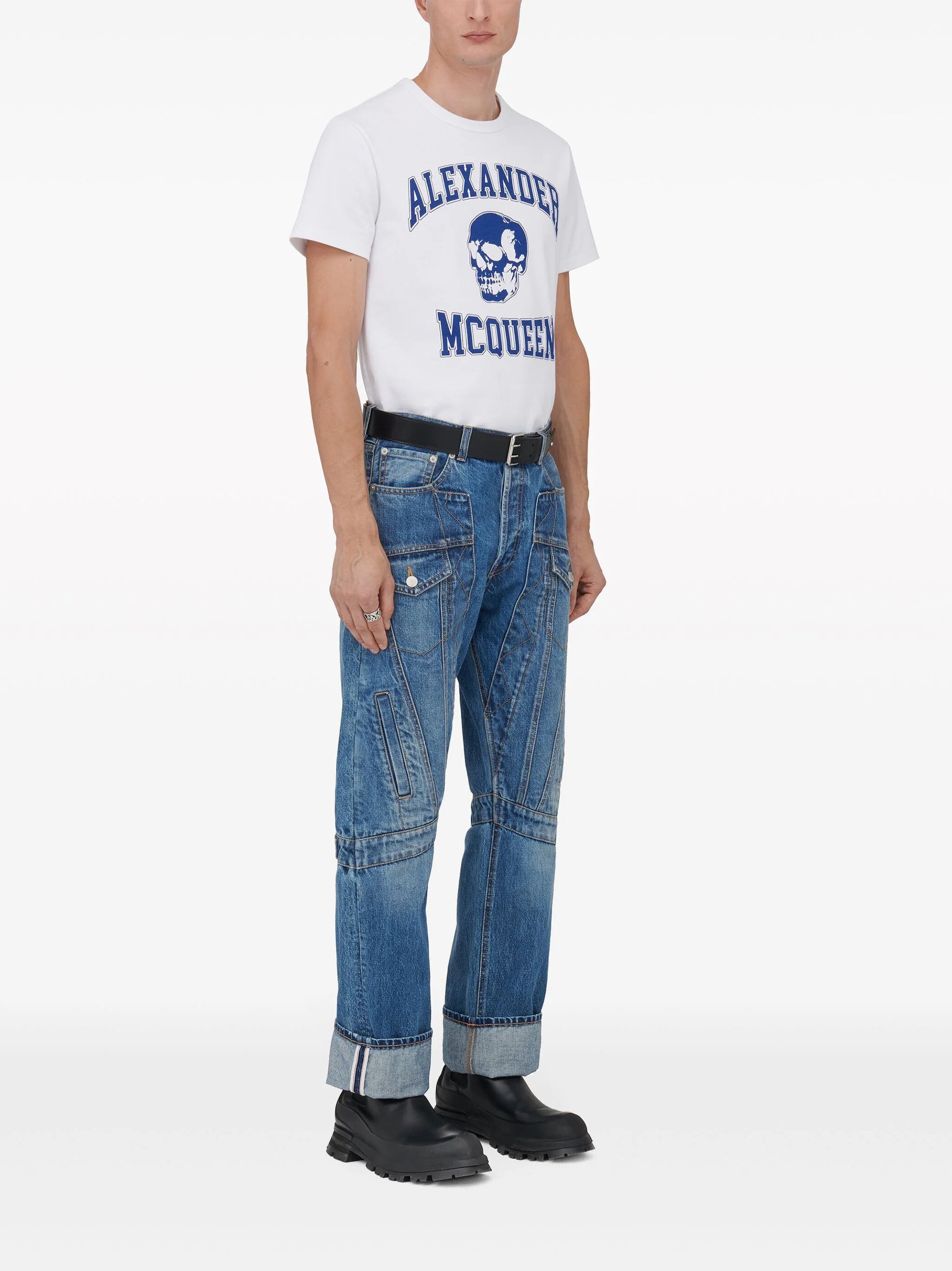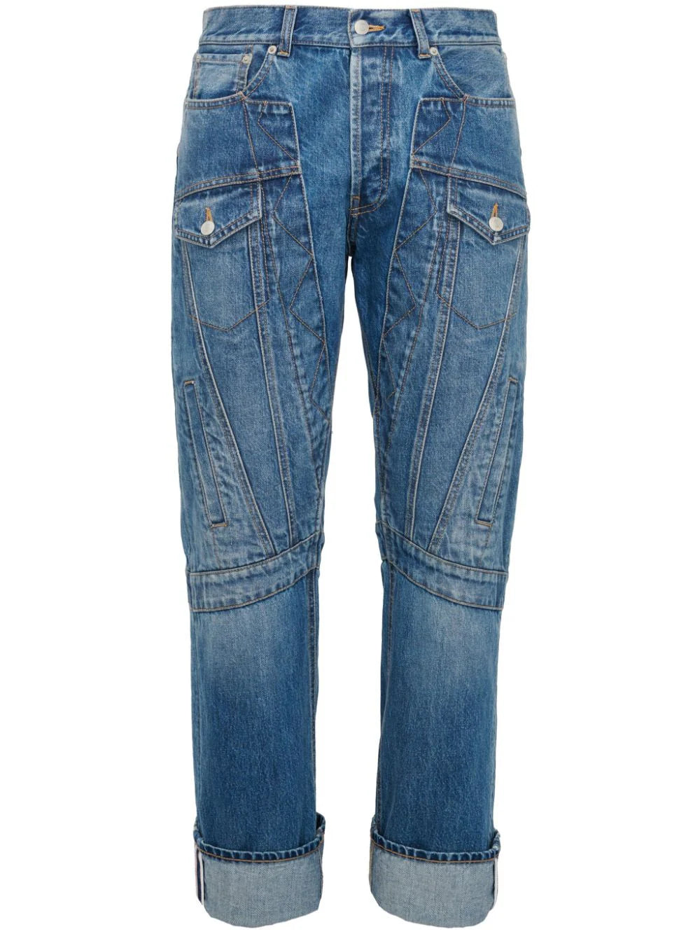 indigo blue cotton denim panelled design concealed fly and button fastening straight leg mid-rise belt loops classic five pockets two front flap pockets two side inset pockets turn-up hem