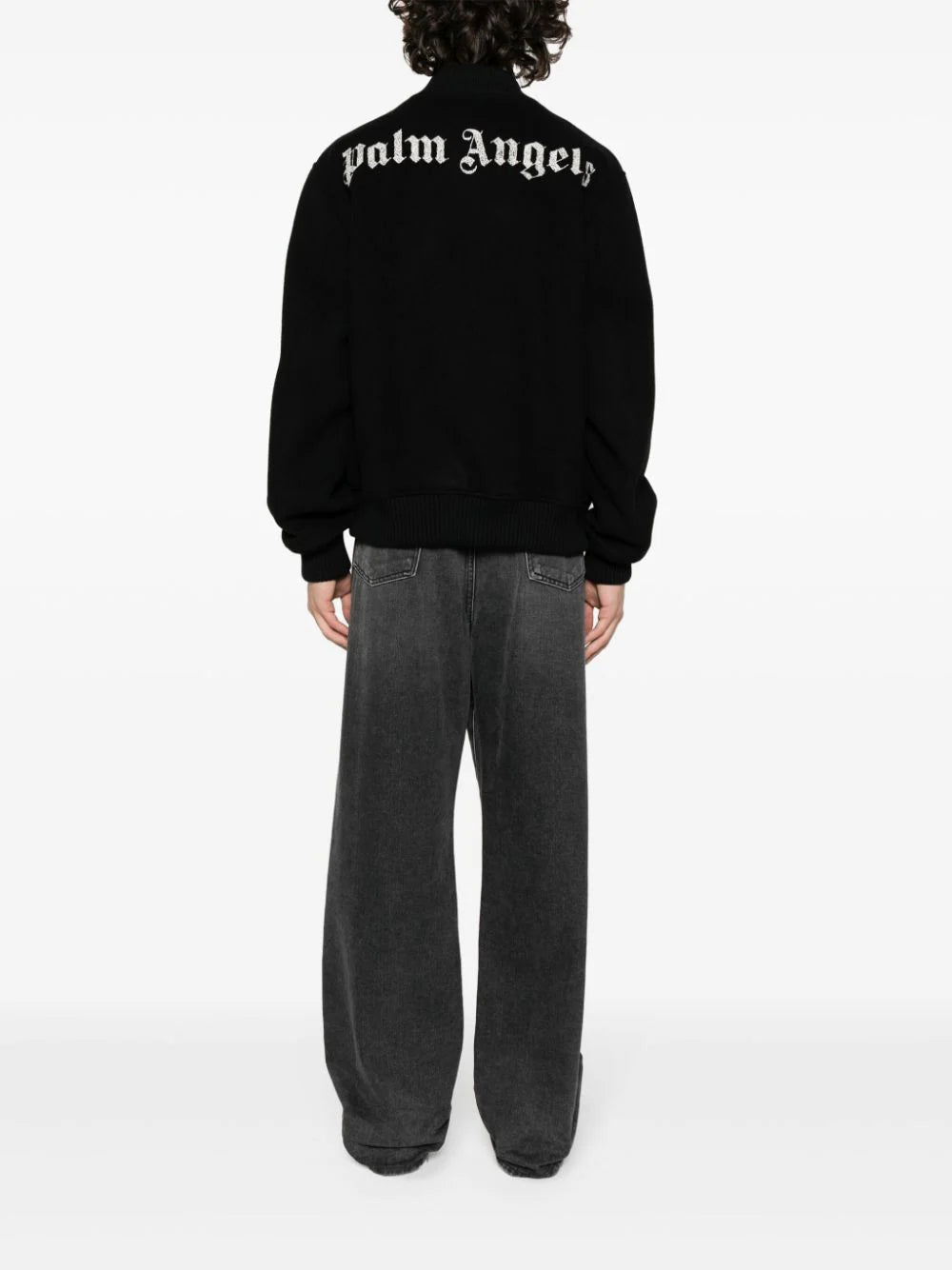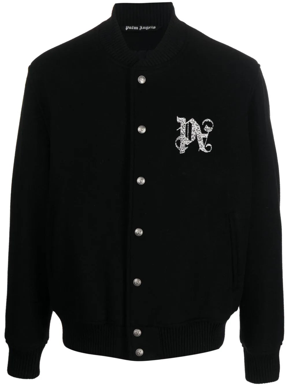 black virgin wool blend felted finish embroidered logo at the chest embroidered logo to the rear logo-embossed buttons baseball collar front button fastening long sleeves two side slit pockets internal slip pocket ribbed cuffs and hem