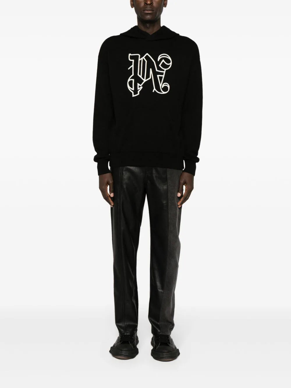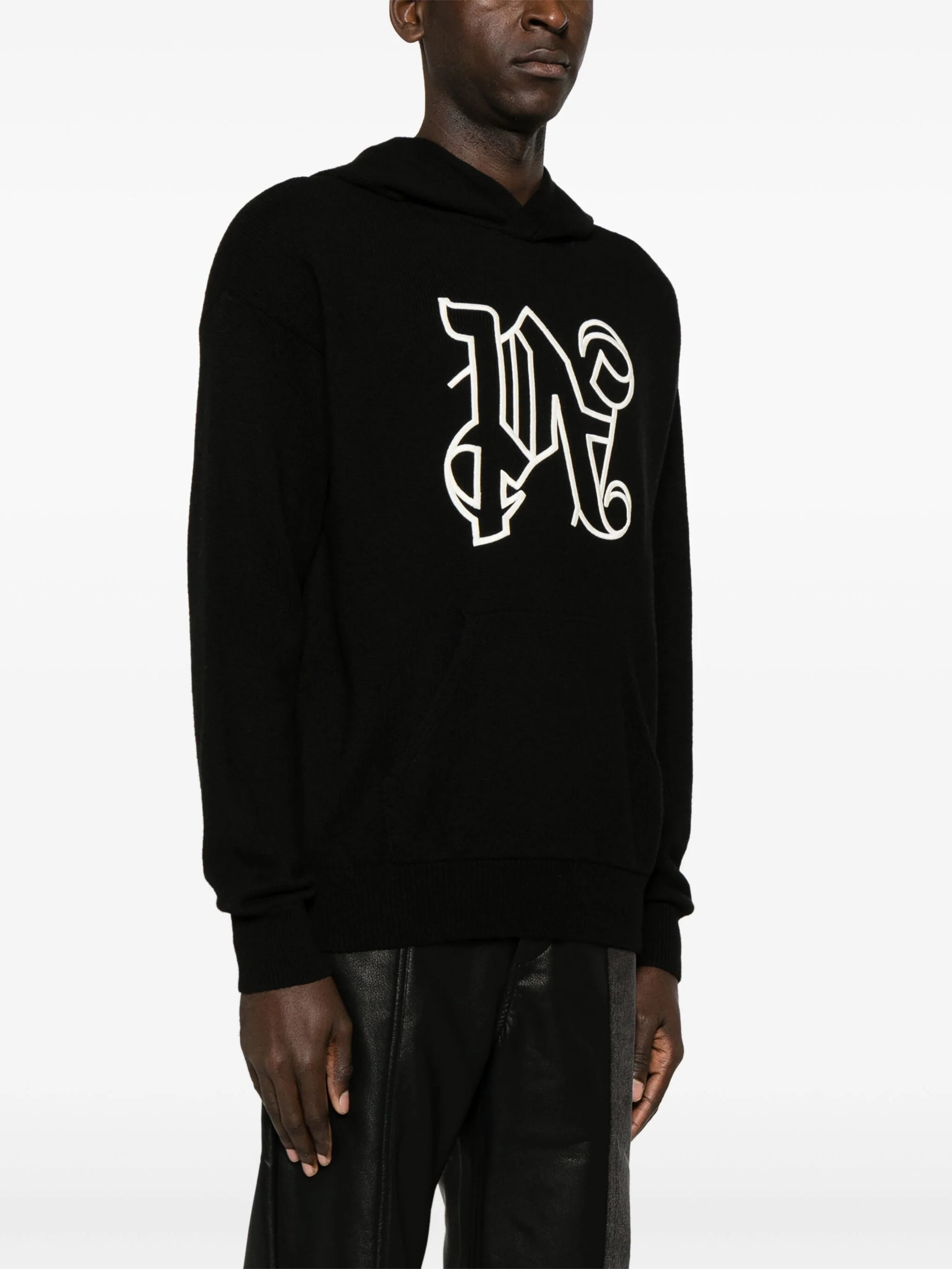black/white knitted construction embroidered monogram to the front slouchy hood drop shoulder long sleeves ribbed cuffs front pouch pocket ribbed hem