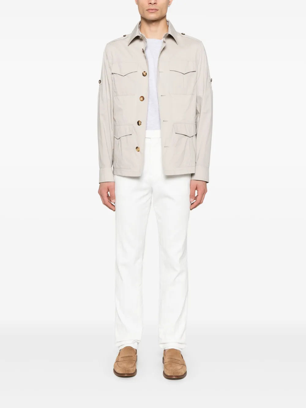 This Multi-Pocket Jacket boasts an almond beige color and boasts a classic collar. Its front button fastening and buttoned cuffs provide a secure and comfortable fit. With multiple pockets, it offers convenient storage for your daily essentials. Elevate your style and functionality with this versatile jacket.
