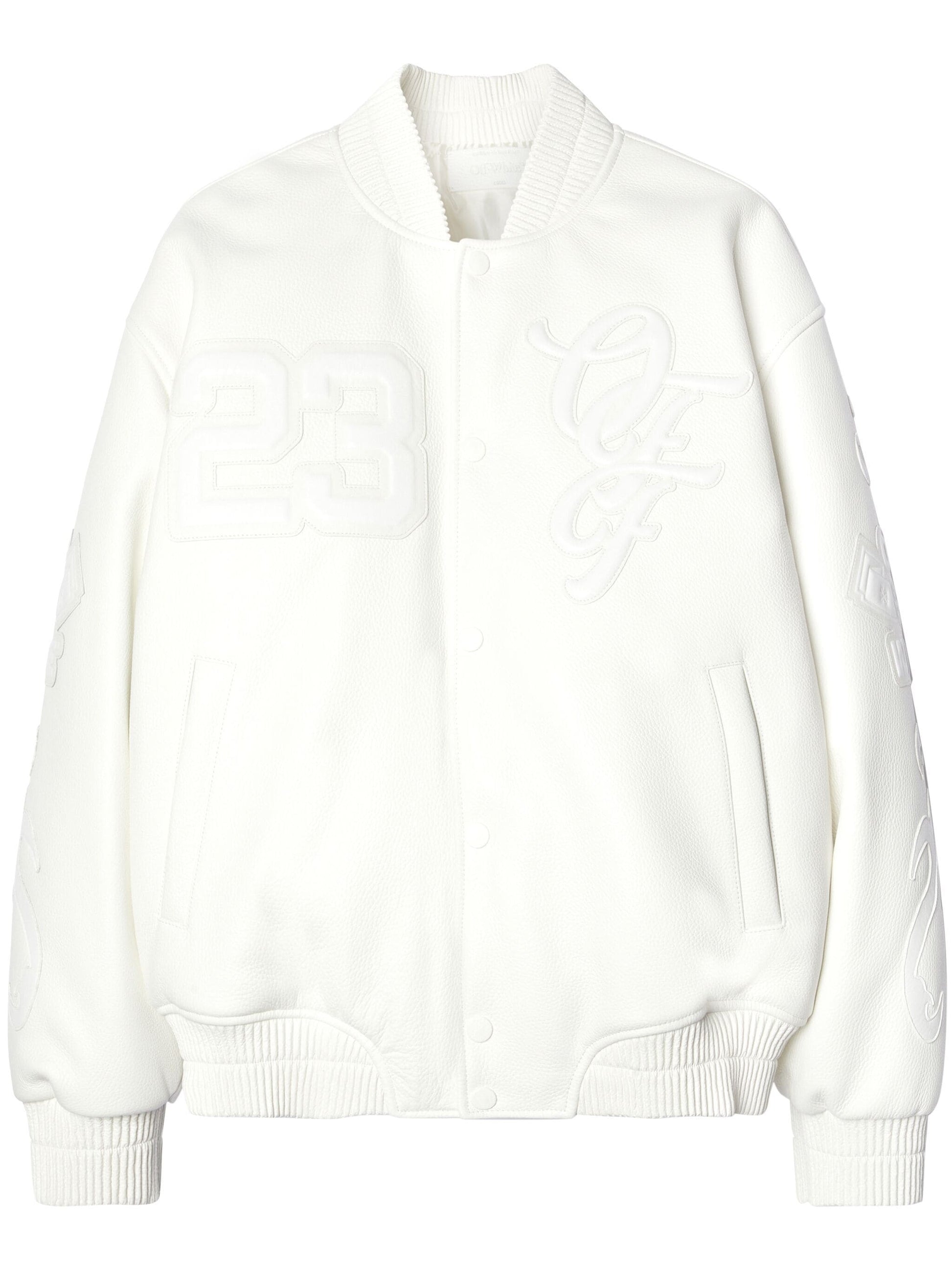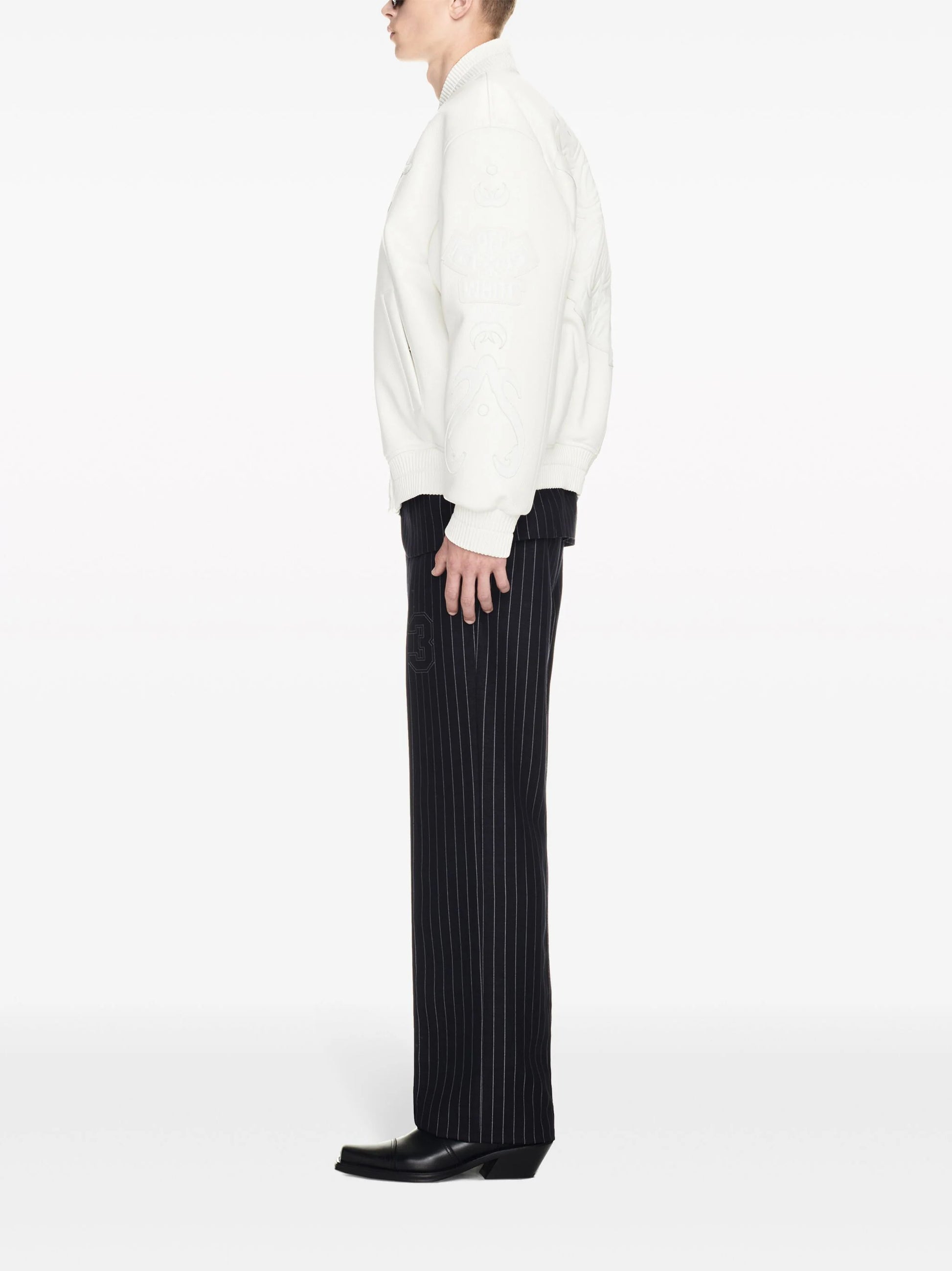 white cotton leather trim patch detail band collar long sleeves front press-stud fastening two side inset pockets straight hem ribbed cuffs and hem